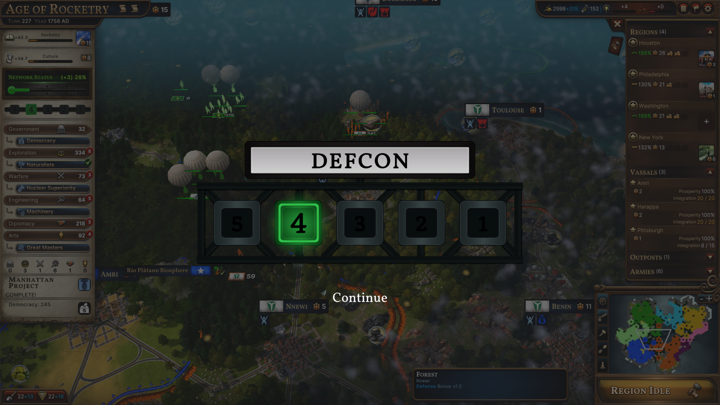 Second, if you have the [i]Atomic Ambitions[/i] DLC, we activate the DEFCON meter. Once nuclear weapons are in play, going to war becomes more dangerous than before. DEFCON tracks the likelihood of nuclear war breaking out, and any hostile action will push the meter closer to DEFCON 1, where tensions become too high to avoid total nuclear annihilation.