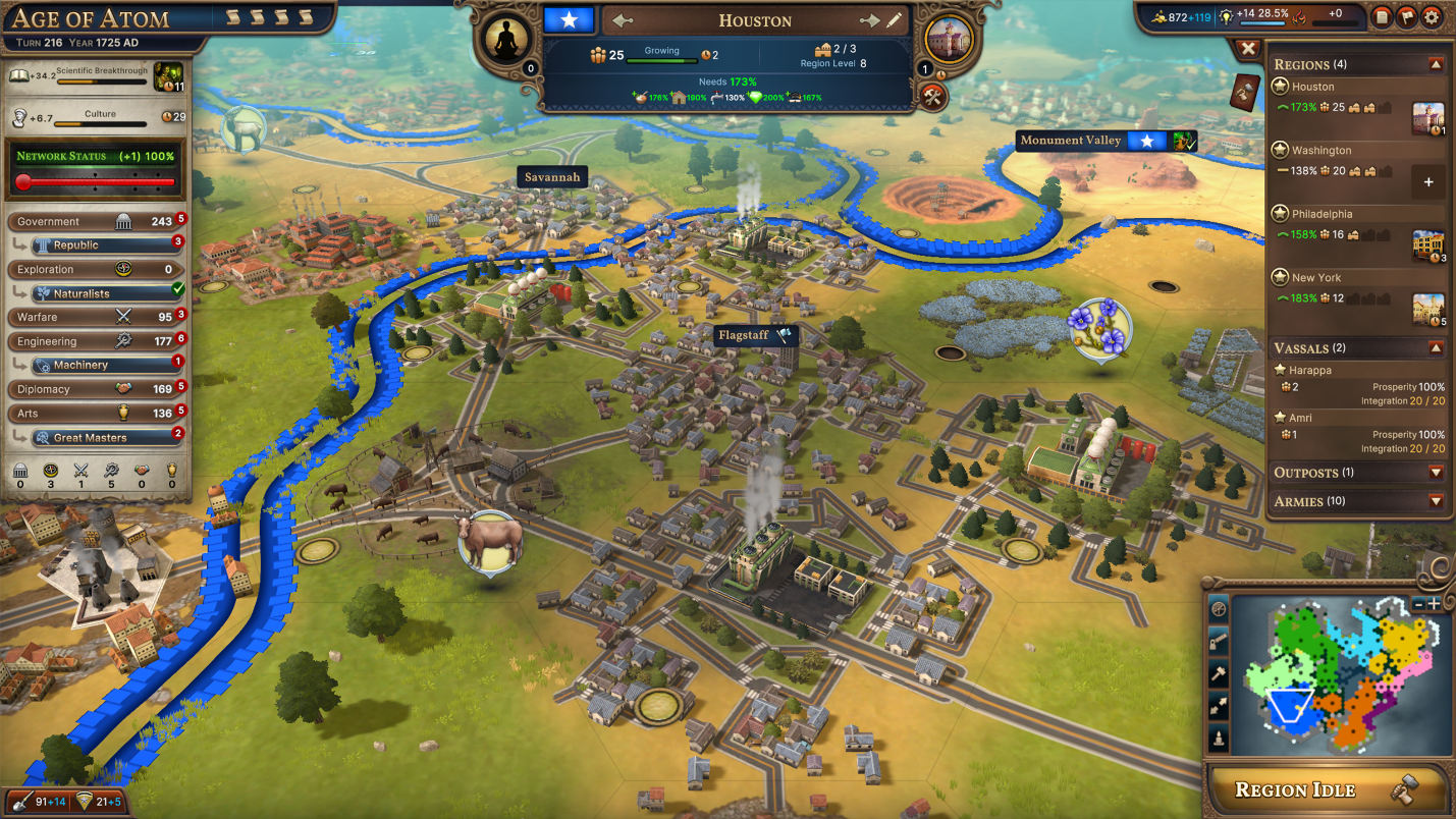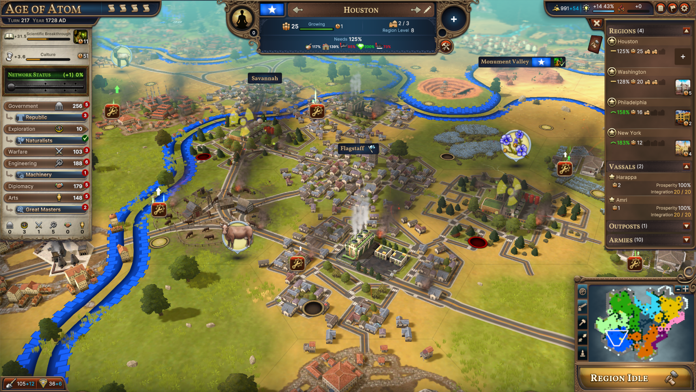 Once you leave the Age of Atom, you’ll notice another subtler effect that plays on the theme of danger and responsibility. Relying on Uranium for so many Improvements can have some nasty byproducts. Once the new sheen of the Age of Atom wears off, the Radioactive Waste byproducts are no longer suppressed for your Uranium based Improvements, and it might be time to reconsider your reliance on Uranium. You may discover that there are some nasty side-effects to the Radium Kitchens that are feeding your populace.