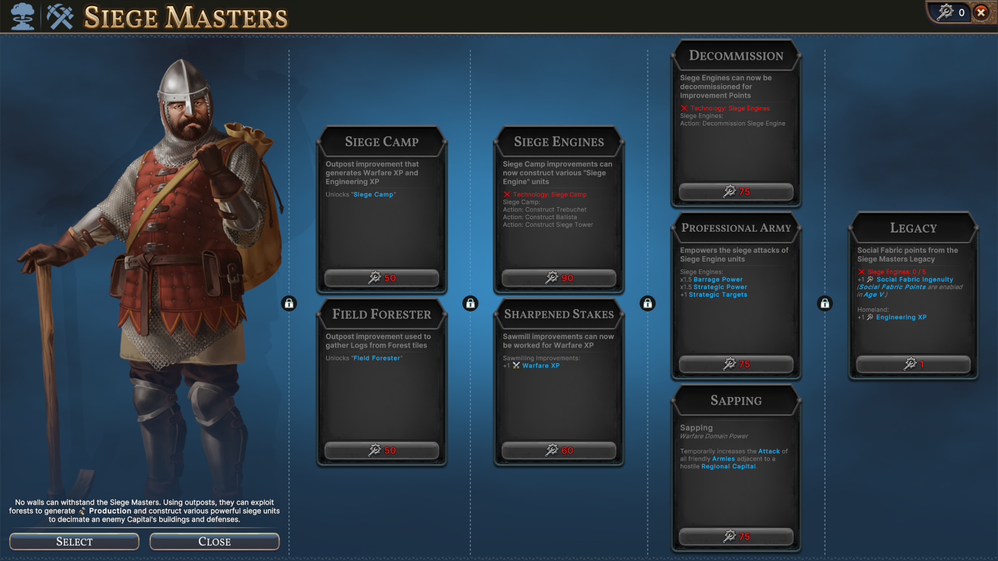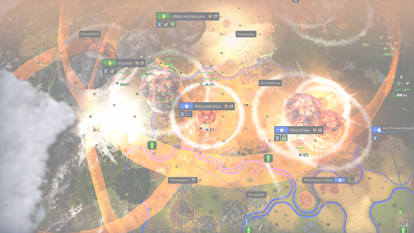 We’re also rolling out the Strategic Warfare update in the next update, which changes how Siege Units and sieging Cities work. At a high-level, Siege Units have better Unit Actions to attack from a safer distance, and Sieging a City now damages the Buildings in that City. (Find more information about this update in the previous Developer Diary) Those changes came about as a result of how we wanted nuclear weapons to behave, but we’ve also updated the existing Siege mechanics to follow suit. Now that Siege is more interesting in the early Ages, we created a new National Spirit to amplify that experience: the Siege Masters National Spirit, included in [i]Atomic Ambitions[/i]. Siege Masters rely on their Pioneers to establish Outposts on the front-lines. These Outposts are homes to the new Siege Camp Improvement, used to build Ballistae, Trebuchet, and Siege Towers at that Outpost. Siege Units built by the Siege Masters also get bonuses to their Barrage damage and Siege damage, cementing their legacy even in the later Ages when you Decommission your wooden war machines in exchange for Cannons and Field Howitzers.