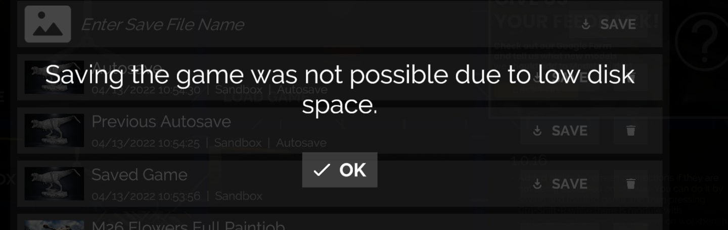 - If there is not enough disk space for saving a game, information about it will be displayed,