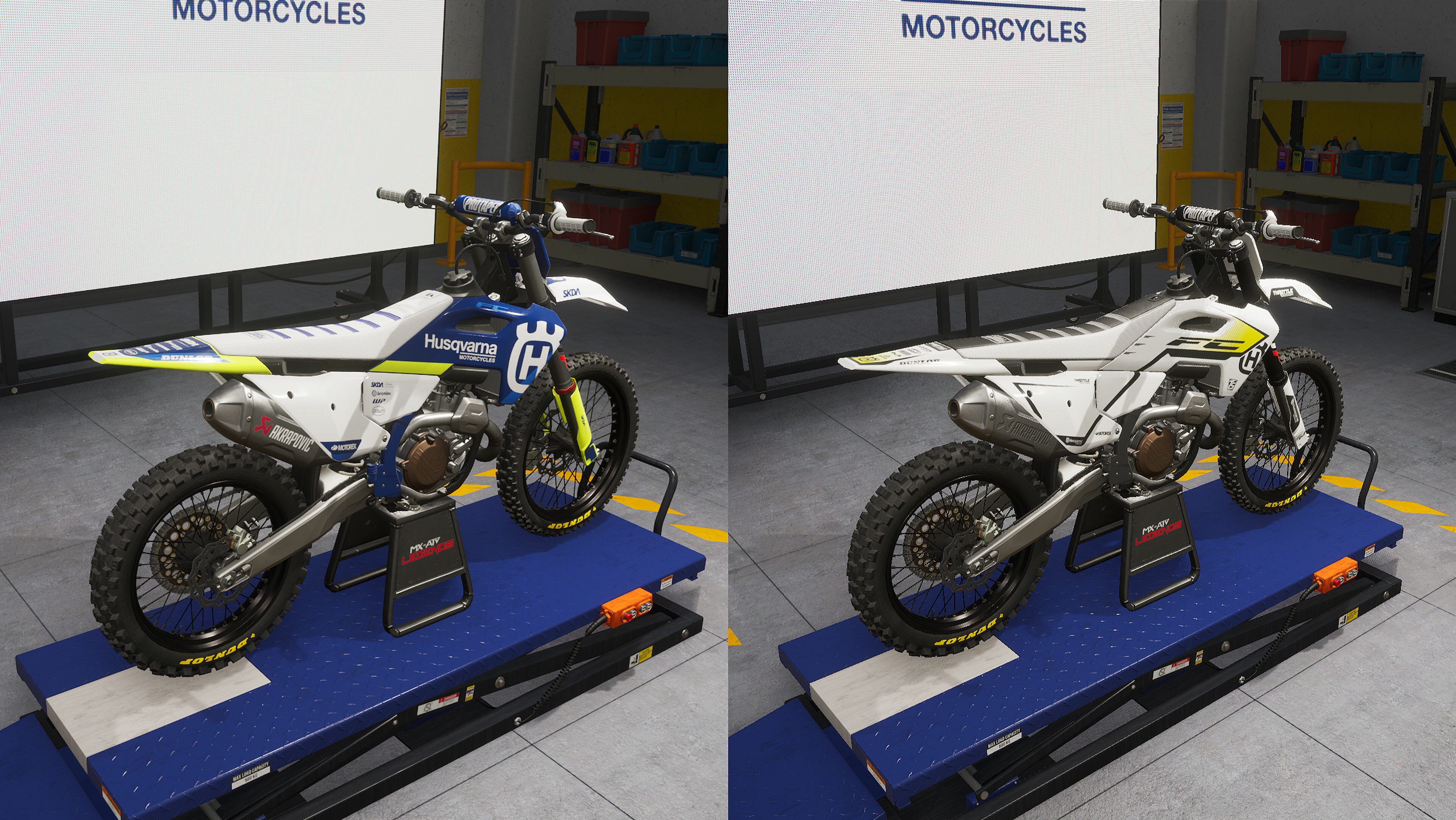 - Two new graphic kits for 2023/2024 Husqvarna bikes have been added to the garage: Throttle Syndicate Rampage and SKDA Class.