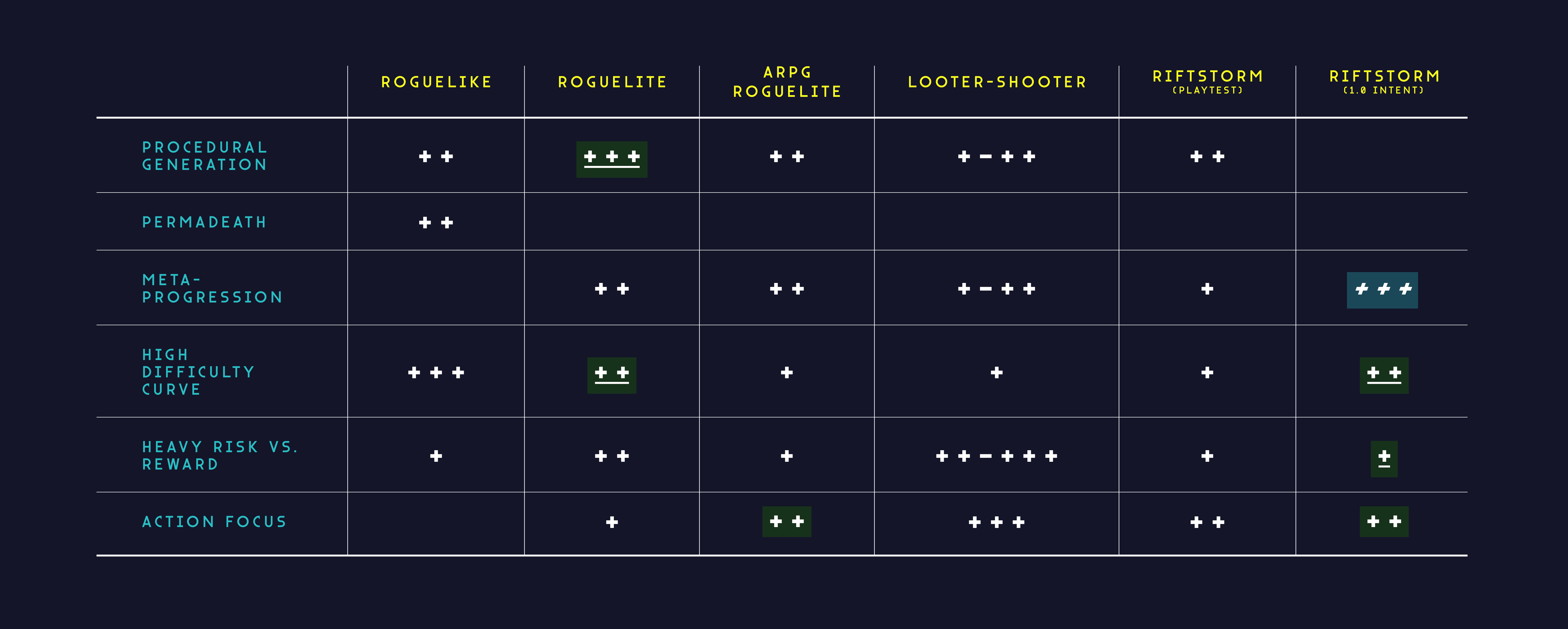 To help visualize our intent relative to market expectations, the table below outlines the “core” gaming expectations for the Roguelike, Roguelite, ARPG, and Looter-Shooter genres and compares them with both the current (Playtest) version of RIFTSTORM and our intended RIFTSTORM 1.0.