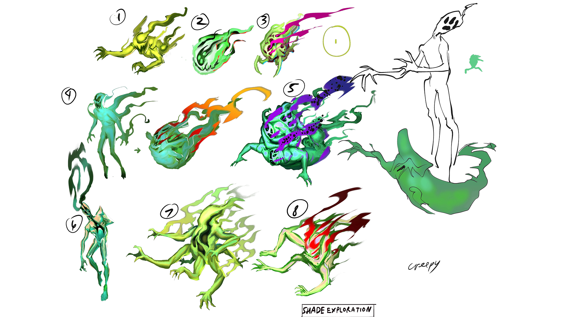 [b]Desar - Sr. Concept Artist[/b] The initial brief for Desar as Senior Concept Artist was to create an enemy with the shape of a "ghost," but not as a representation of a spirit. "It's more like a shapeless energy born from human emotions, so initially, I explored the shape of Shade as a representation of emotions, such as anger represented as a fireball shape, and so on." he explained, while showing us his exploration sketches of Shade.