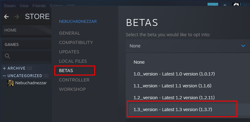 Saves from version 1.3.x are not compatible with the current version, but campaign progress is. After the release, the latest version 1.3.x will be available through the Steam beta branch, so you will be able to finish unfinished missions. [i]How to change Steam beta branches:[/i] [expand type=details] Right click to Nebuchadnezzar in the Steam library and then select "Properties".