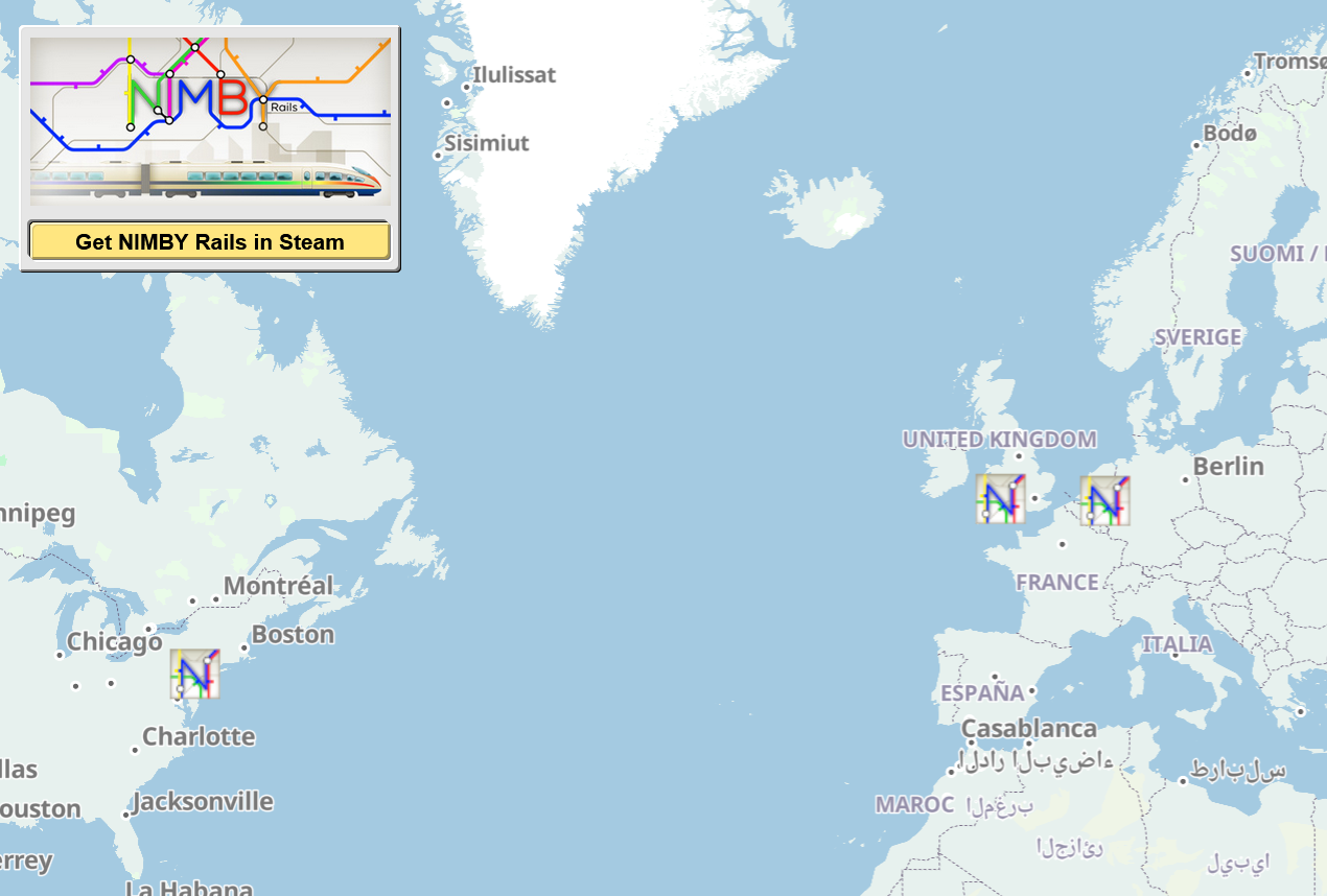 The game sharing system is built around a new web site hosted in [url=https://share.nimbyrails.com/]share.nimbyrails.com[/url]. This web site collects all the shared saves by players, and offers two main features: a dedicated page for the save, with a preview of the tracks and buildings, and the download link for the save (1.7 can load saved games directly from the Downloads folder of your PC). And the site home page, which shows a world map with a icon for every shared game.