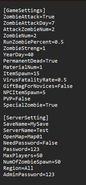 Create the Game.ini file (this is a text file) under .\steamapps\common\NoOneSurvivedServer\WRSH\Saved\Config\WindowsServer\ or download [url=https://1drv.ms/u/s!AhvGbZ0VZWm3ggcOis6XuPRmtY3y?e=MxanRv]it[/url] here