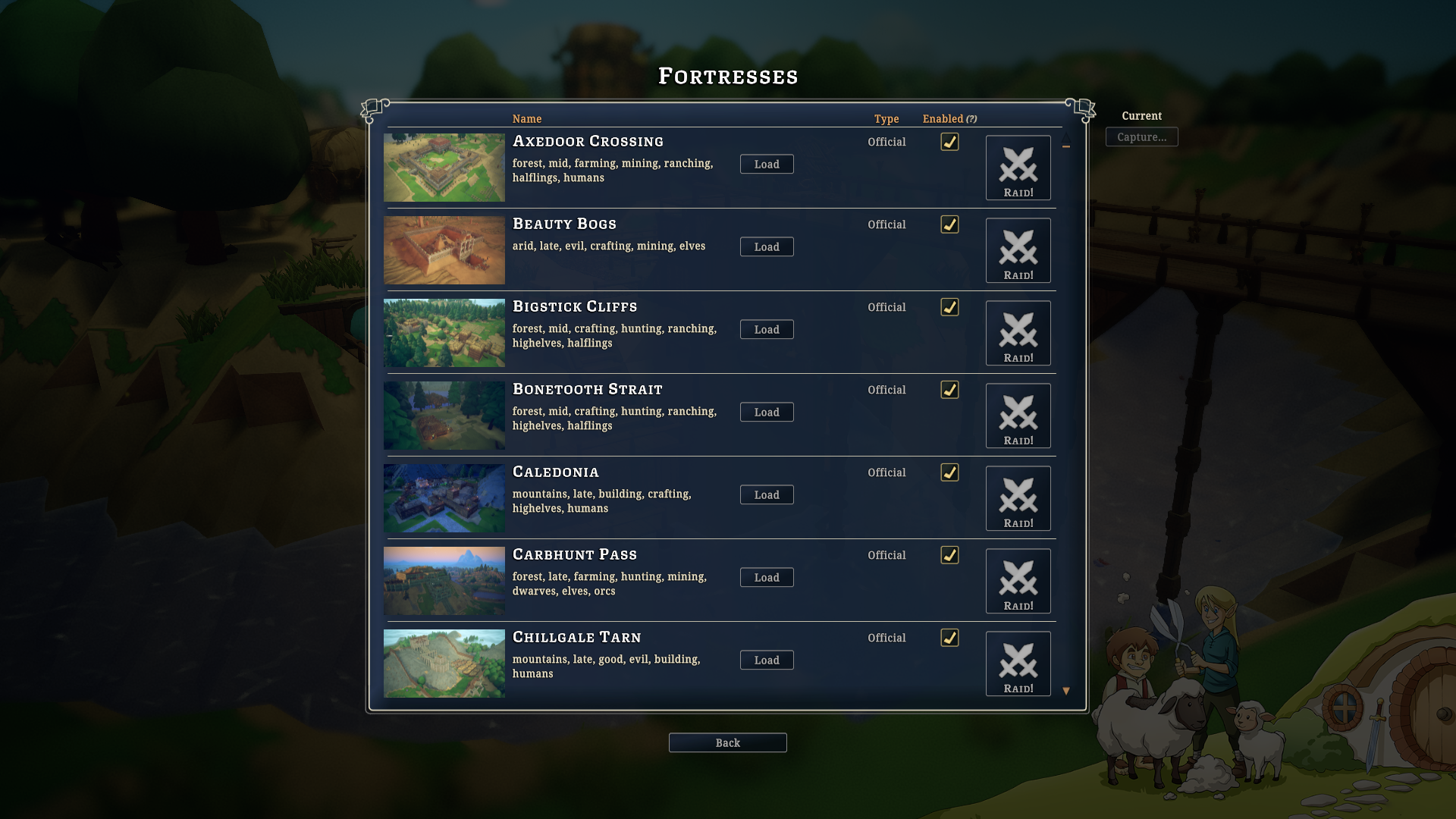 The Fortresses screen shows you a list of all Fortresses in your game. It includes the combination of Official, Local, and Mods. The Enabled toggles choose which Fortresses your NPC Kingdoms can use. [i]Choose Fortresses that can be used in your world and try them out[/i]