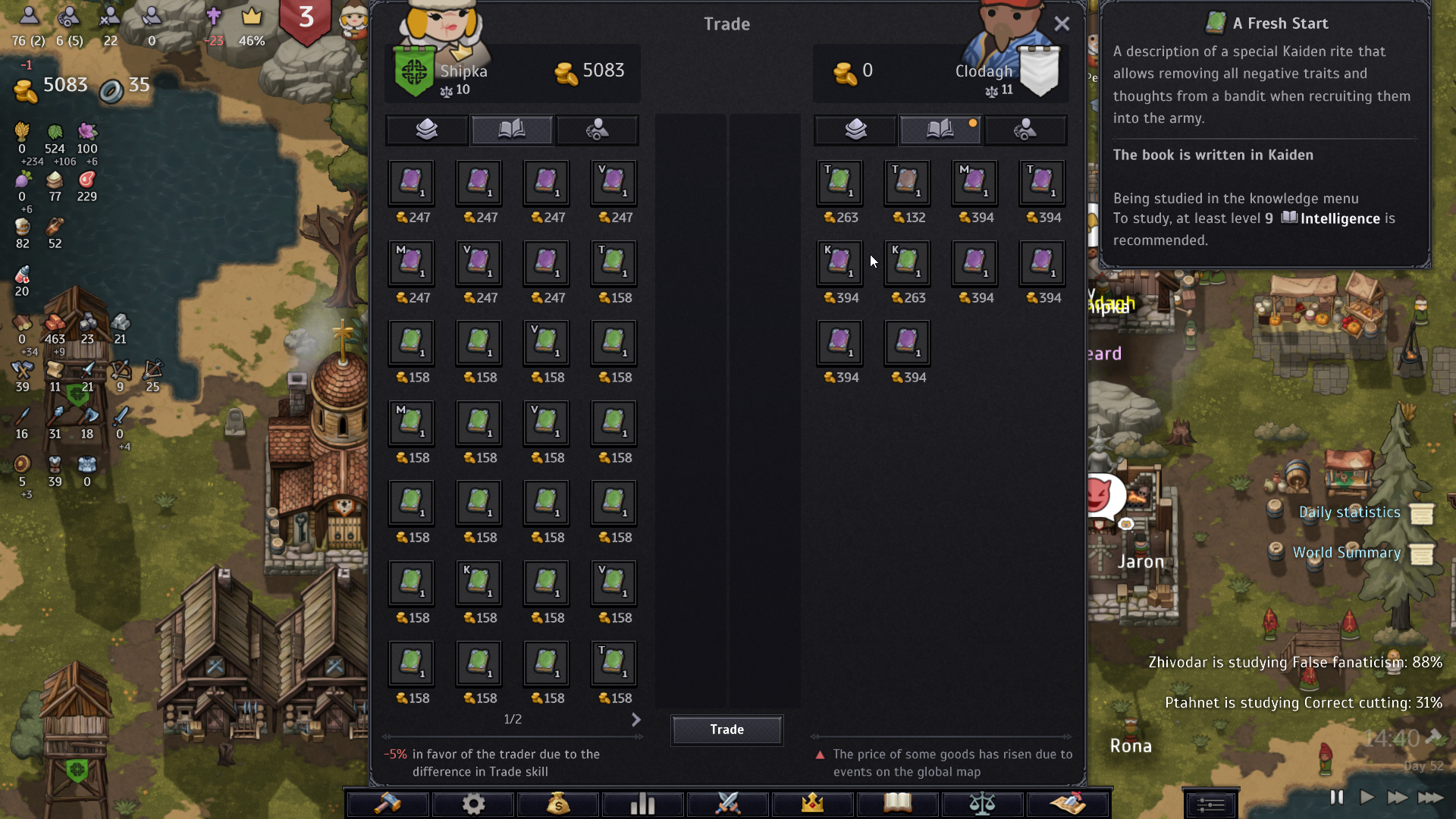 [expand type=details expanded=false][b]Gray Contracts - Makha[/b] Using trade slang and intermediaries will allow you to reduce the church tax on trade contracts. [b]Demand Expansion - Makha[/b] The skill of selling goods to those who don’t need them ensures an increase in local demand for all goods. [b]Narrow Font - Makha[/b] More compact writing reduces the use of Paper when creating books. [b]Sanctity of Power - Tanaya[/b] A theological treatise explains how Mother Sophia's grace can be revealed to earthly rulers. By the grace of the Church, your king will be able to receive a holy Blessing (requires good relations with the Matriarch). [b]Sophia’s Protection - Tanaya[/b] A set of arguments that convinces the Church to grant the protection of the Loving Family (usually reserved for young noble houses) to your province for a limited number of days. Requires good relations with the Matriarch. [b]Apology of Divorce - Tanaya[/b] While the Loving Family does not approve of divorce and usually requires very good relations with the Matriarch, this knowledge will lower the requirements, convincingly proving the necessity of divorce in exceptional cases. [b]Repentance in Hatred - Tanaya[/b] An ancient rite of repentance for the sin of hatred that grants absolution to the seeker. The rite allows the Bishop to reconcile the chosen lord with all their enemies. Requires good relations between this lord and the Bishop. [b]A Fresh Start - Kaiden[/b] A description of a special Kaiden rite that allows removing all negative traits and thoughts from a bandit when recruiting them into the army. [b]Master of the Dagger - Kaiden[/b] An ancient combat art of Kaiden culture. Combat Skill for all warriors when using a Dagger: +5. [b]Ointment of Durability - Kaiden[/b] The special formula of this ointment enhances the durability of wood and iron joints, reducing the chance of weapon breakage by 5 times. [b]Recruits - Kaiden[/b] Old imperial training methods allow inexperienced recruits to gain more experience during training on the Training Ground. Effective until the warrior’s Combat Skill reaches level 5. Effective until the warrior’s Combat Skill reaches level 5. [b]Hammer of Bandits - Kaiden[/b] Psychological training in moral righteousness and duty, granting a mood bonus to warriors during battles with forest bandits. [b]Faith Defender - Tanaya[/b] The tax on warriors will be 30% less.[/expand]Balance