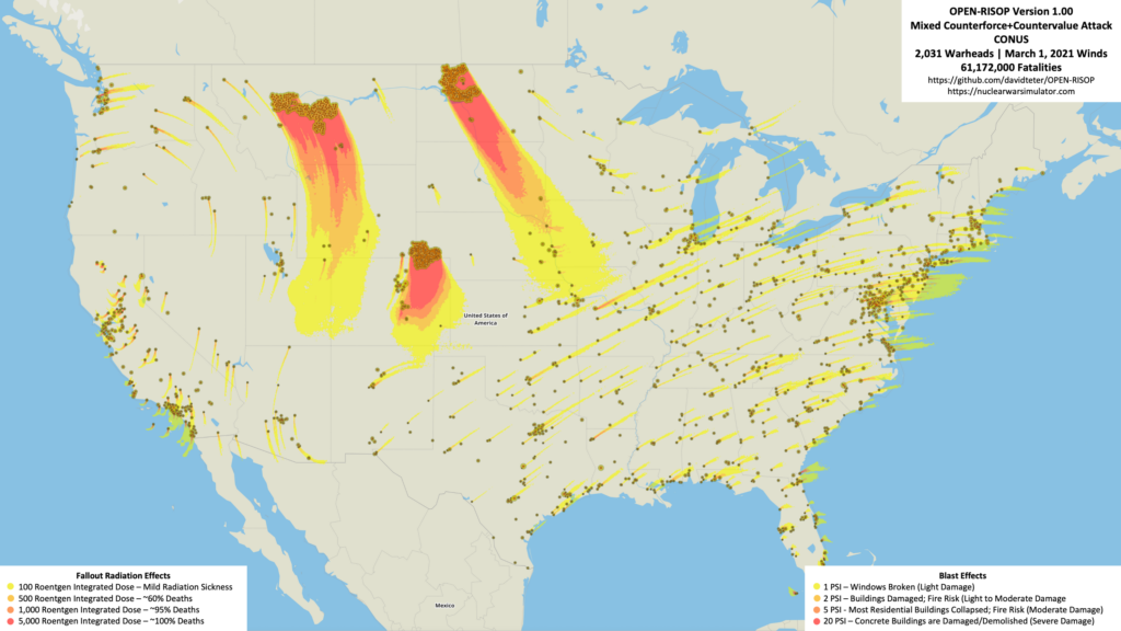 There are other scenarios where the user has no control over the events but instead replays a prerecorded sequence of launches and detonations. Such a scenario can be used to tell a very specific story or to share the results of the detailed HYSPLIT fallout calculation. HYSPLIT can take multiple hours of calculation on large scenarios so this is a convenient way to save and share the results. Currently, NWS includes the results of all 12 scenarios of the OPEN RISOP database by David Teter (https://github.com/davidteter/OPEN-RISOP).
