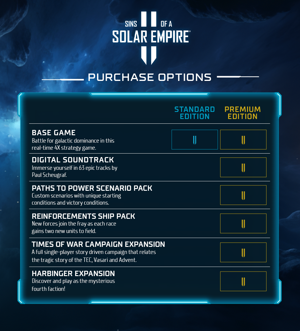 https://store.steampowered.com/app/1575940/Sins_of_a_Solar_Empire_II/ [b]The base game edition[/b] is available at a special discount price of $39.99 for a limited time. [b]Sins of a Solar Empire II - Premium Edition[/b] is available for a limited-time price of $79.99 and includes the base game, first Content Pass [i](see image below for details!)[/i] and the Sins of a Solar Empire II soundtrack. The sequel to the iconic Sins of a Solar Empire, a classic strategy title known for masterfully blending real-time and 4X strategy gameplay, Sins of a Solar Empire II boasts a new engine that allows for even more epic space battles, larger sprawling empires, and signature unforgettable Sins moments. [previewyoutube=3KkaFBIz7lo;full][/previewyoutube] “From multiple races to emergent tactics to a detailed galaxy simulation system, we’re giving our community multiple ways to conquer the galaxy in Sins of a Solar Empire II,” said Brian Clair, director of publishing, Stardock Entertainment. “With today’s launch on Steam, we’re looking forward to supporting our fans with even more great DLC content and the release of our Mod Tools and Mod Browser to see what our community does with this next evolution in the Sins franchise.” Sins of a Solar Empire II features gameplay enhancements that let players take full control of how they conquer the galaxy. Emergent tactics like protecting vulnerable units from missile strikes with Titan ships, or launching surprise ambushes using the dynamically changing orbits of planets are now possible. Sins of a Solar Empire II will reward players for creative thinking, effective use of economic systems, and making convenient allies as they take over the galaxy.Key Features: