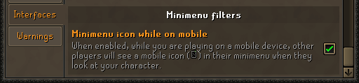Training while chatting isn't so easy when you're playing on a mobile device, and if you stopped grinding to chat, well that'd be XP waste. Have you ever just wished other in-game players could see that you're on a mobile device, so they'll understand why you don't want to strike up a conversation over the fishing spots? We've prototyped a discreet little indicator that mobile users could optionally choose to show in their right-click menu, if they want to: