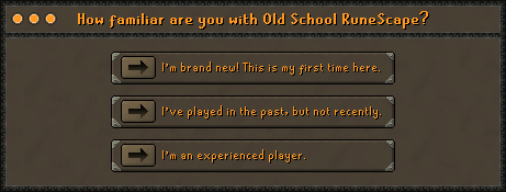 Right after creating and naming your character, you’ll be asked a simple question: "How familiar are you with Old School RuneScape?" This new dedicated interface replaces the old NPC chat box and presents three big, bold buttons you can't possibly miss.