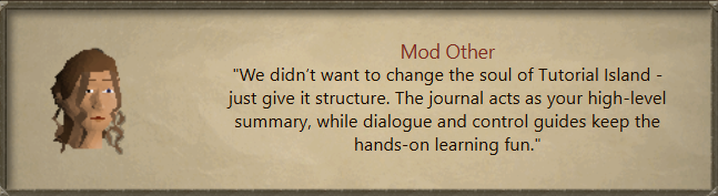 At the same time, every NPC conversation on Tutorial Island has been rewritten to be shorter, clearer, and more characterful. Before, dialogue boxes often tried to do too much - mixing world-building, control tips, and instructions into a single wall of text. Now, there’s a clear divide:- Dialogue = story.