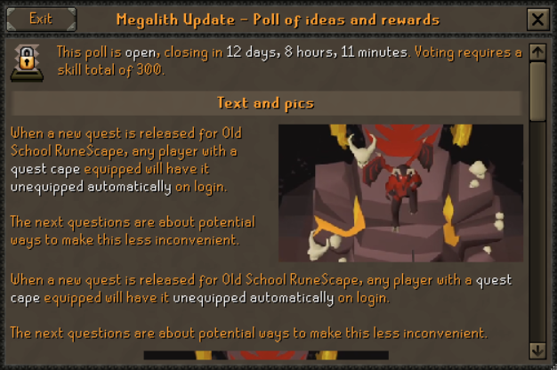 Polls can now include text blocks, images, and headers - even direct links to blogs for more context. No more flipping between the game and your browser just to understand what you’re voting on. Polls are now as readable and informative as a proper Old School news post - just with more voting.