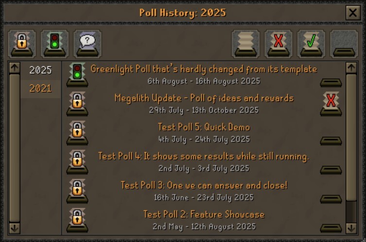 Not every poll in Old School is a simple "Should we add this?" anymore, and now, the game makes that clearer than ever. We’ve updated the poll interface so you can easily see what kind of poll you’re voting in - whether it’s a Lock-in, a Greenlight, or a casual Opinion Poll. These poll types have been part of the community process for a while, but until now, it wasn’t always obvious which was which. Here’s what each means:- Lock-in Polls: These are the commitment-style votes. If a proposal passes the 70% threshold, we’ll go ahead and make it - unless we hit an unexpected development hurdle, in which case we’ll explain why.