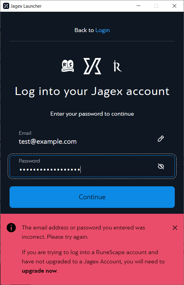 On Thursday January 18th, the Jagex Launcher will be undergoing maintenance for general security improvements. The exact time will be posted via our social channels and shared on the [url=https://secure.runescape.com/m=news/game-status-information-centre?oldschool=1]Game Status page[/url]. We don't expect there to be any downtime. As part of this, players will be required to log back into the Launcher with a [url=https://www.jagex.com/en-GB/accounts#_ga=2.179608484.1418181160.1704289292-1487957001.1701856760]Jagex Account.[/url] If you are already playing via the Launcher, you will be able to continue playing until you either log out or attempt to change world. After this, you will then be required to log back in with your Jagex Account credentials. Those of you who've been using RuneScape accounts to log into the Launcher will be required to upgrade to a Jagex Account. Upon attempting to log in with a RuneScape account, you will see this message: