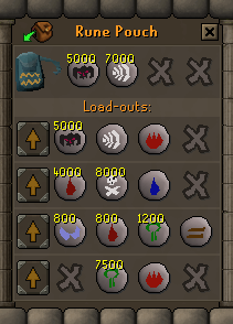 Keep moving down and we get to what you're all waiting for: Load-outs. Clicking any of the arrows (on the left of each row) will automatically replace whatever's in your pouch with whatever load-out you've selected. Any displaced runes will be moved into the Bank, while any runes 'added' to the pouch will be added in the following order of priority: