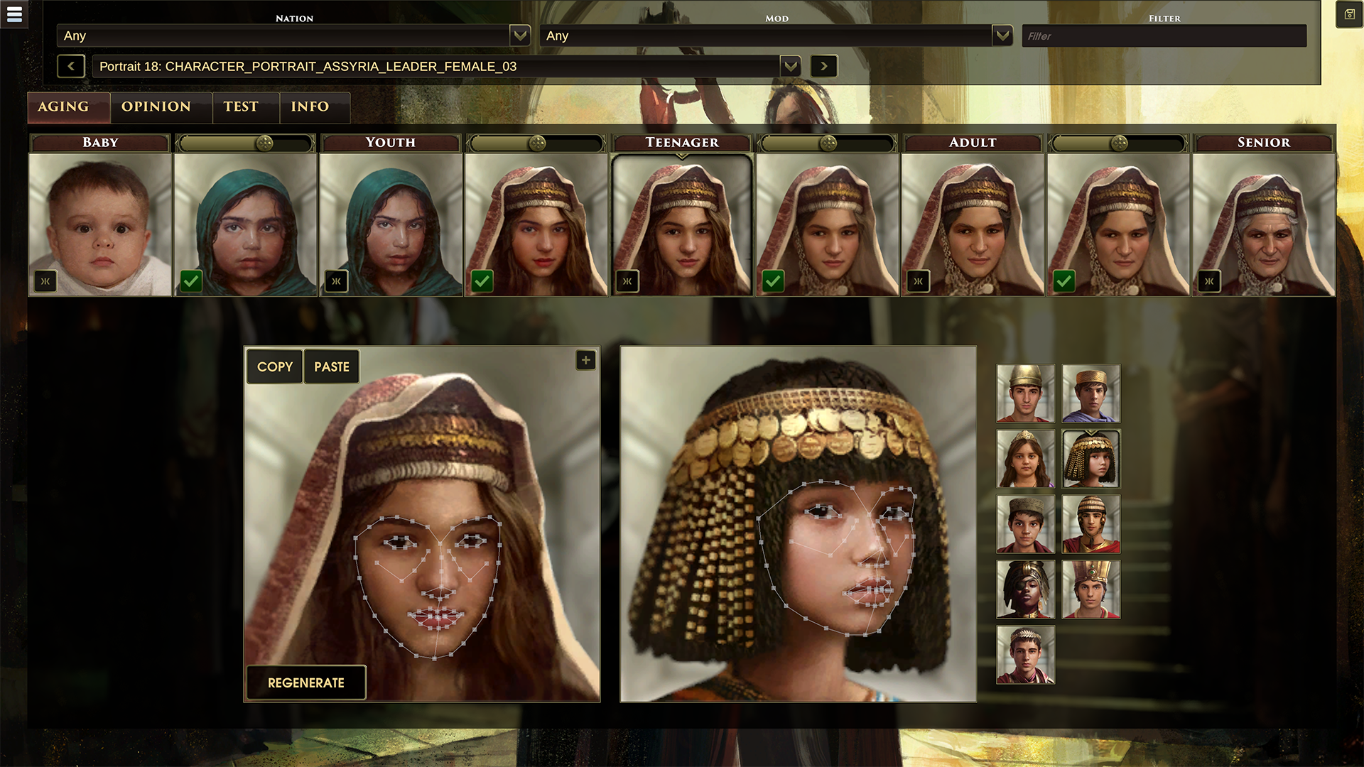 While the Portrait Editor is a great tool for modders, players will already be able to reap the benefits of the new content we've put in place, as in-game characters not only age gradually, but their facial expressions will change dynamically based on that character's opinion of the player's faction leader. Let's look at these two concepts in a bit more detail! [b][u]Aging[/u][/b] In Old World, portraits are organized into sets of five, representing Baby (ages 2-6), Youth (6-15), Teenager (15-23), Adult (23-60), and Senior (60 and up). Previously, these images would be static, and only change when a character moves from one age bracket to another. With the new Interpolation features, a combination of crossfading and subtle modification allows a pair of sequential age groups to merge together into a single image, which changes over time as a character progresses from one age group to another. Once a character shifts into the next bracket, the process starts again with the new "current" age-group portrait and one after that, and so on. [u][b]Opinion[/b][/u] Portraits now also display a character's expression based on their opinion modifier of the player's faction leader. These portraits are configured with these expressions to show that character's most extreme negative expression (Furious) at -200 opinion, and most extreme positive opinion (Friendly) at +200 opinion. With these two extremes set, the game then blends between the two (much like how it does with aging), so that you can get a range of expressions based on where within that spectrum a character is sitting at any given time.