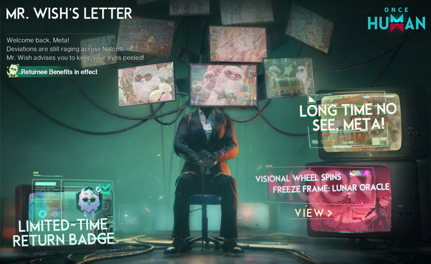 A letter from Mr. Wish brings a special gift for returning Metas! Event Period: Triggers upon login and lasts 28 days. Accounts that haven't logged in for over 14 days will qualify. 1. Greeting Gifts Mr. Wish has prepared a gift for returning Metas, containing a rare Deviation, an Asterism Crate and a Cosmetic Crate. Hope you enjoy it! Claim your gift to kick off the Returnee event, and return to the path of the Meta! 2. Limited-Time Return Badge & Return Buff Once the Returnee event is triggered, returning Metas will receive a limited-time badge, Mr. Wish's Love—a special mark of honor that can be displayed on your namecard! Mr. Wish also grants returning players a powerful temporary buff: Mr. Wish's Favor. While this buff is active, teaming up with friends to complete dungeons or Public Crisis Events will earn you Mr. Wish's Collection ×1, up to 25 per week. Open it for a generous amount of Starwish Tokens and a chance to get the Chefosaurus Rex stickers! You can redeem Starwish Tokens for rewards in the Starwish Redemption Shop!