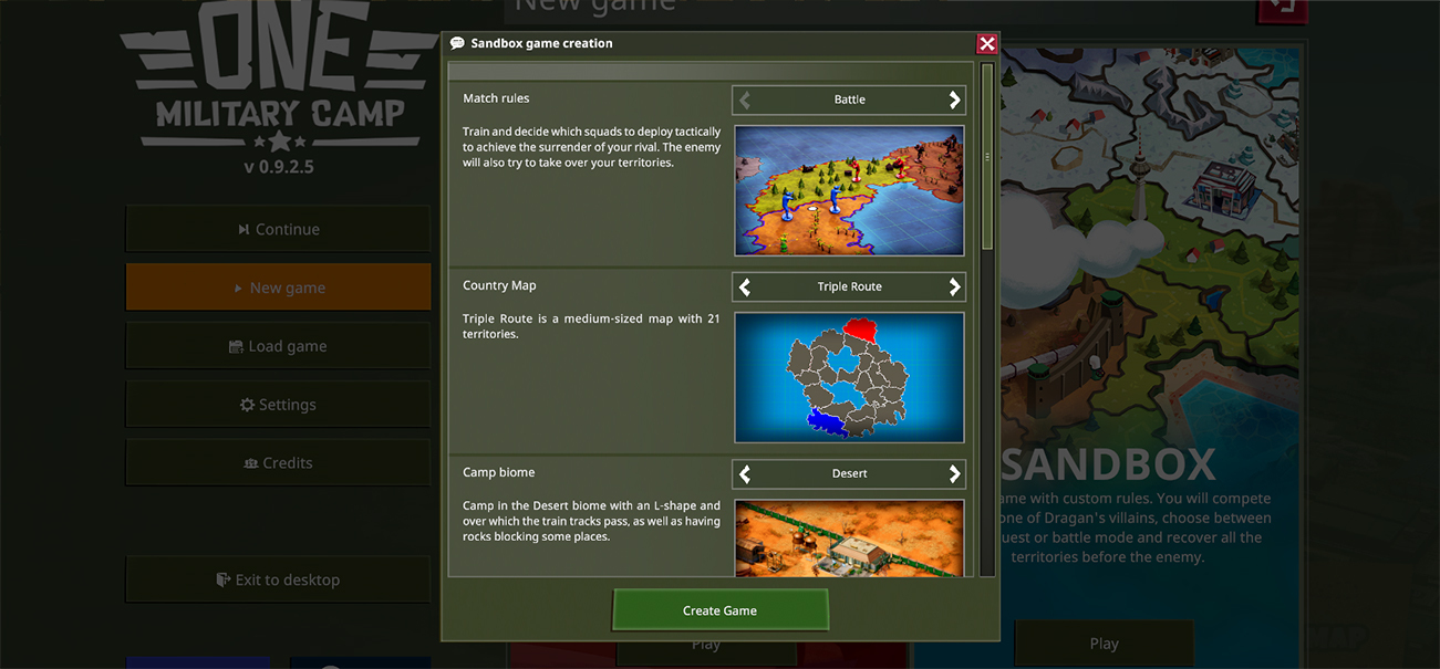 - [b]Battle[/b]: a 1vs1 against the enemy. Both of you will have to train and deploy squads strategically around the map until you manage to besiege the opponent’s camp. Don’t relax, the enemy AI will also try to advance mercilessly until it defeats you.