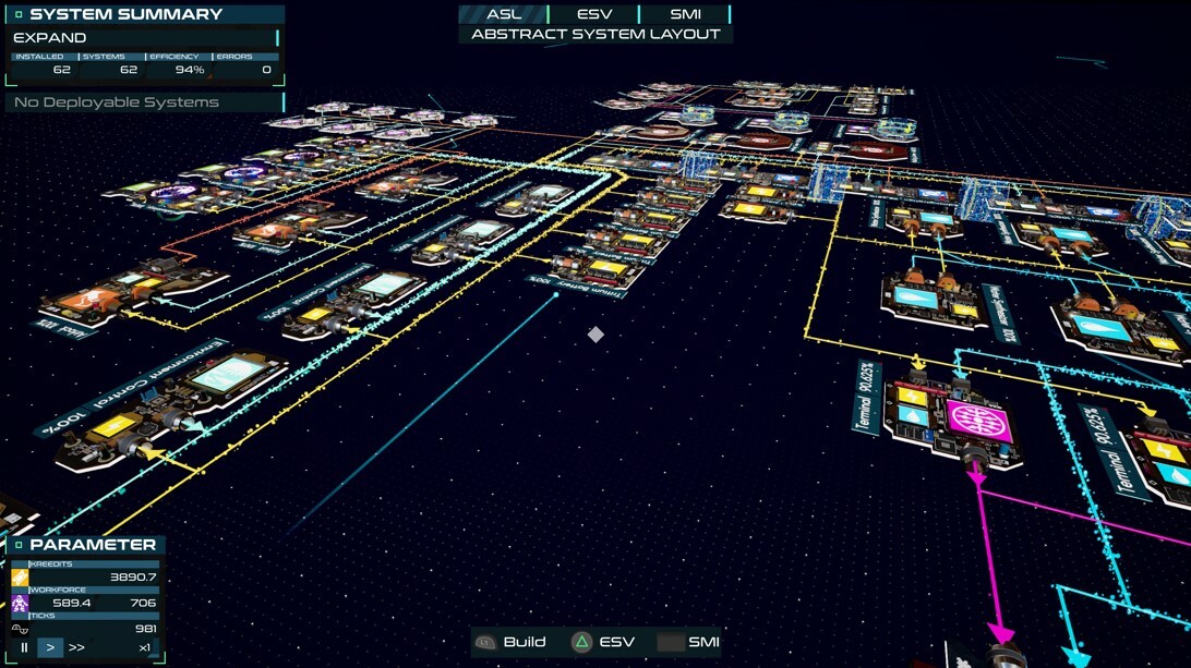 Systems look very much like computer chips and may be placed freely on the circuit grid. Each system has up to 4 input possibilities, either no or 1 output port and they start being fully operational as soon as they are fully connected by Players who draw or drag wires between the corresponding ports. Wires and their corresponding ports have different colors depending on the resource that is produced and transported. [b]Electricity[/b], for example, is represented with the color yellow, all systems from the [b]Defense[/b] category are represented with the color red, systems from the category [b]Research[/b] are represented with the color green, and so on. A given system’s output may range from 0 to 100%, depending on its input values. If there aren’t enough resources to feed the cycle, efficiencies may drop below 100%.