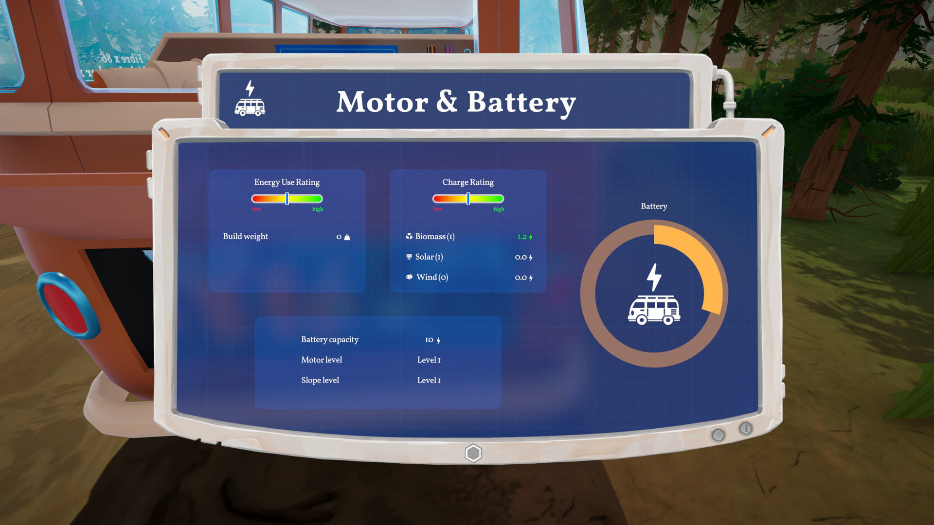 In the beginning, the vehicle uses a bio burner that can burn biodegradable resources to fuel the electric motor. When progressing the game you will be able to expand and ultimately replace the bio burner with solar and wind energy, building a fully sustainable energy solution for your vehicle.