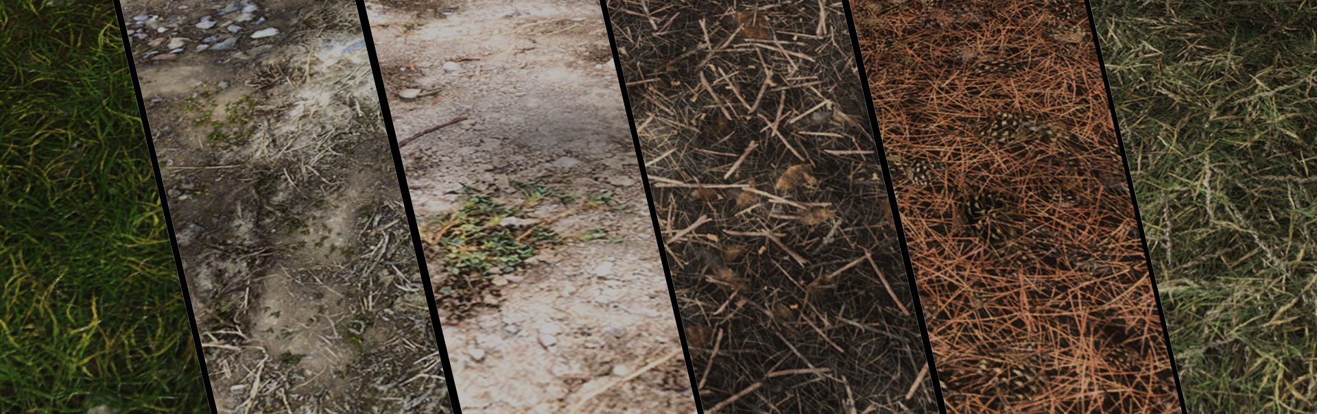 With a world as big as OUTBRK’s (625km²), there’s going to be a ton of ground to cover, literally! We’ve begun the next pass of improvements to the world and along with that and the Unity update comes higher quality ground textures. Here are 6 of the 28 different ground textures that will make up the terrain of OUTBRK.