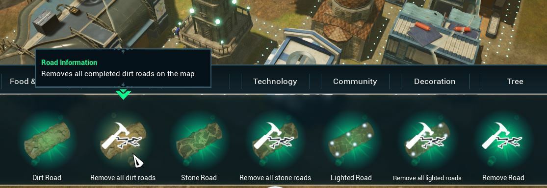 There are 3 new buttons on building menu - roads section: Remove all dirt roads - Removes all completed dirt roads on the map Remove all stone roads - Removes all completed stone roads on the map Remove all lighted roads - Removes all completed lighted roads on the map