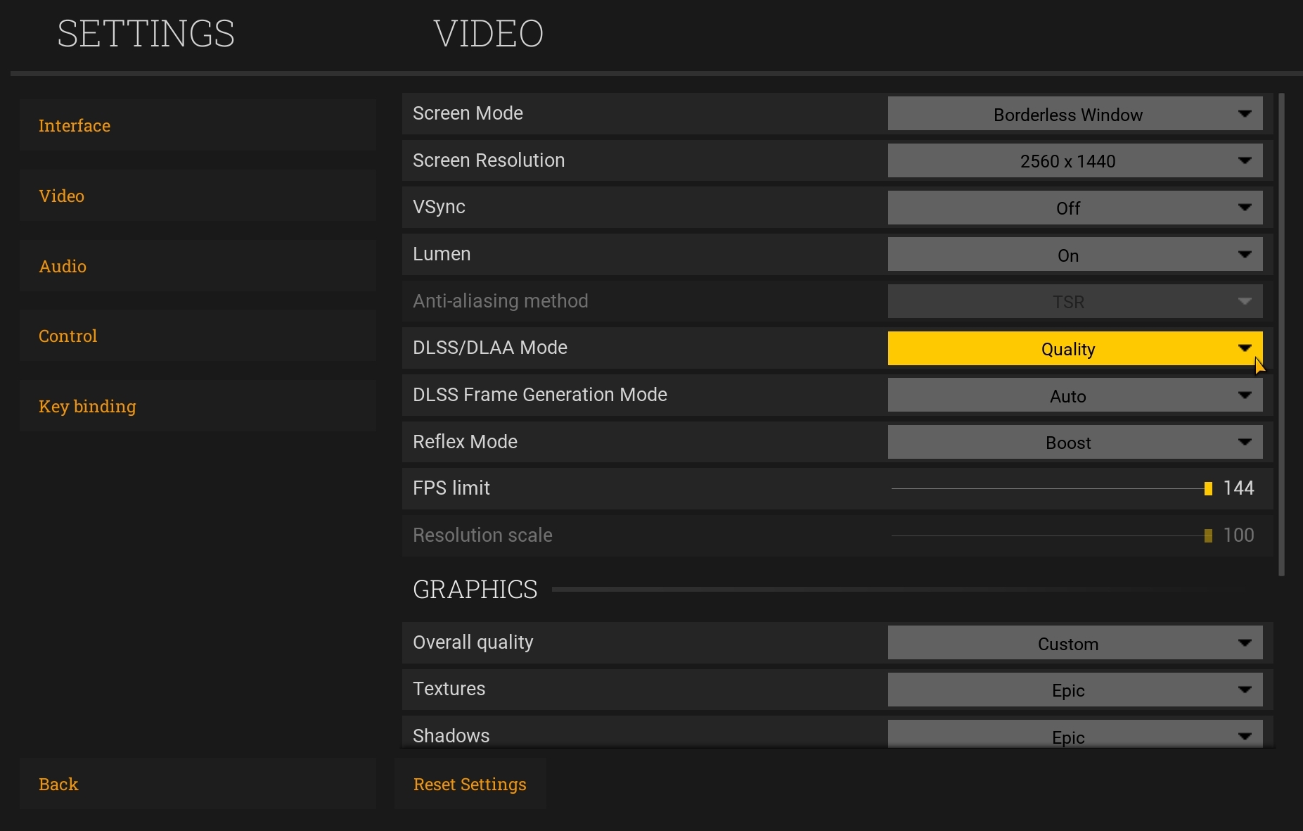[b]Note:[/b] When DLSS is enabled, image scaling and TSR anti-aliasing settings are locked and adjusted automatically based on the selected DLSS options. There's no need to tweak them manually.