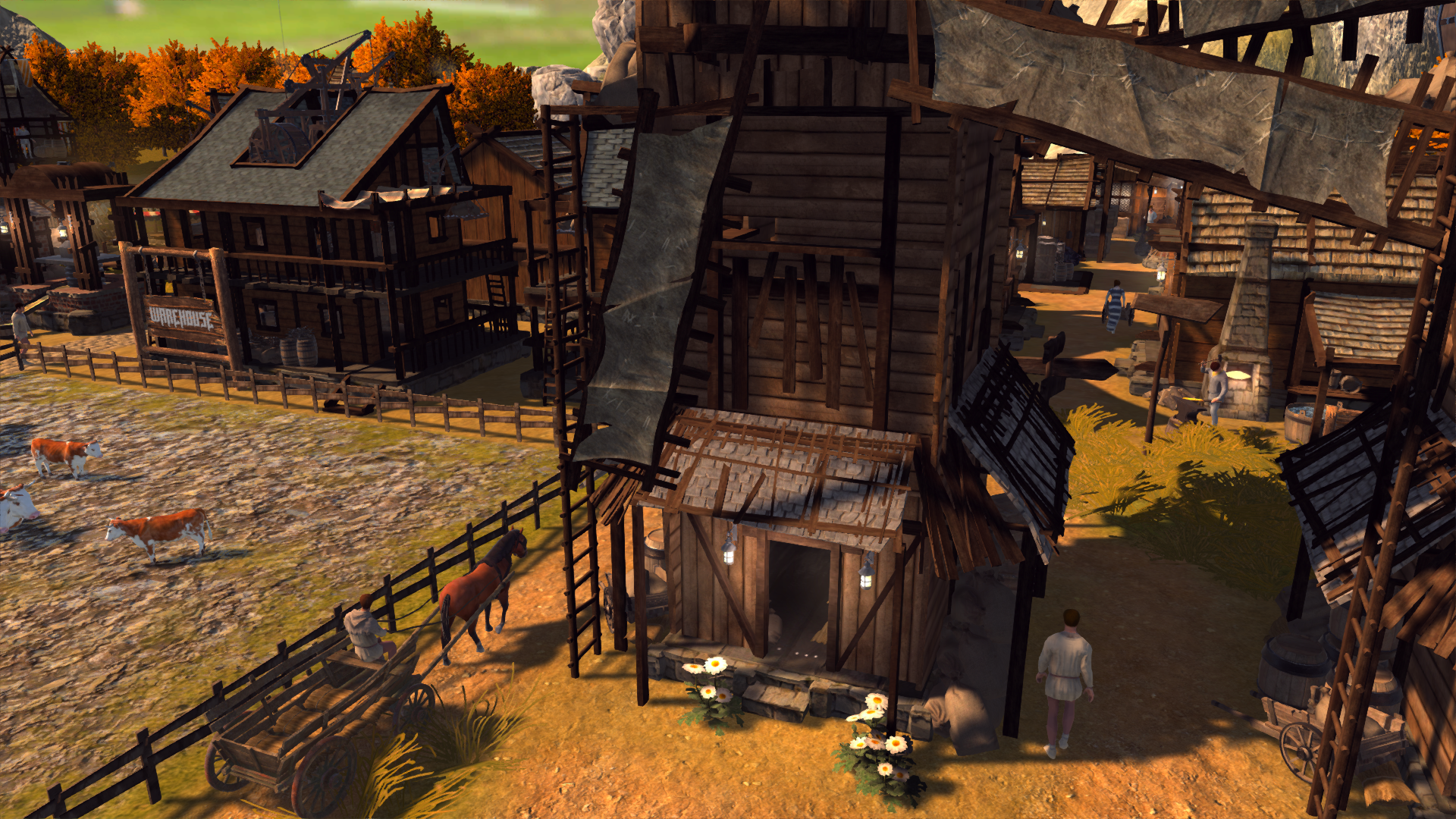 Access to horses and carts is very simple – as soon as you build your first farms or other food producing parcels, [b]carts will appear in your depots[/b] and your people will start using them as help when gathering and transporting harvest. No more carrying everything on foot!