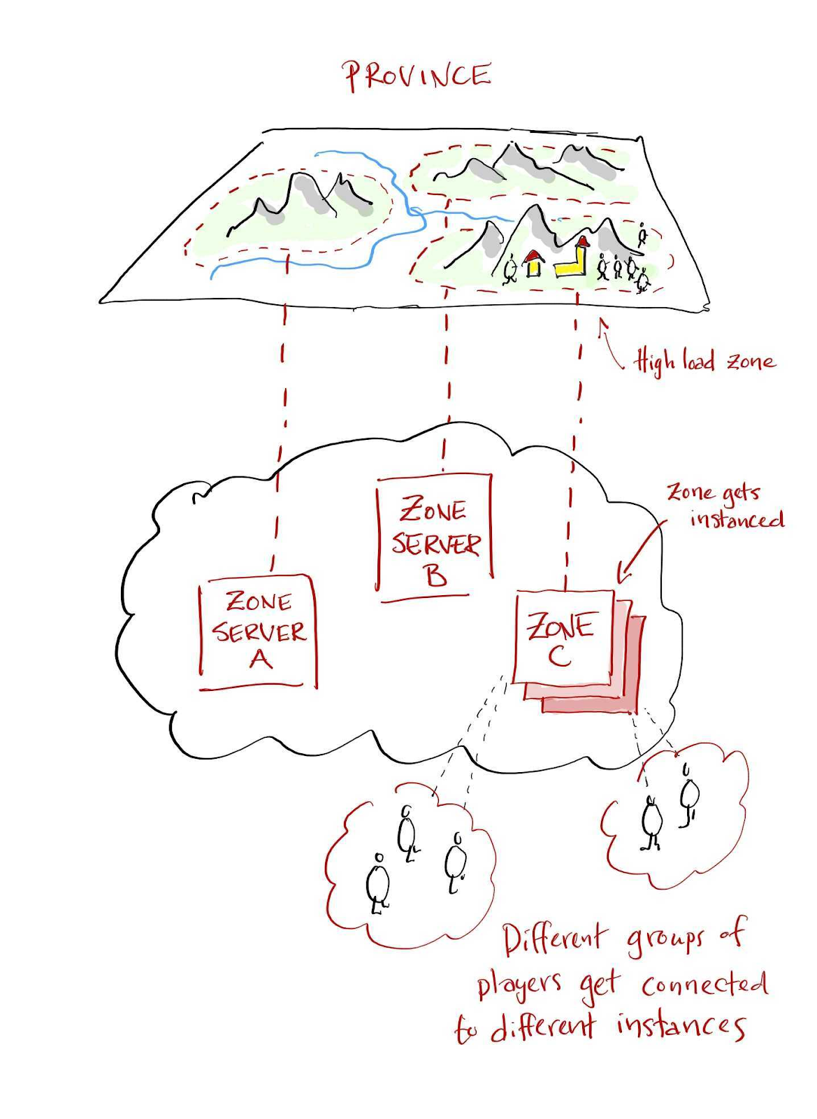 As mentioned above, a zone server is a dedicated Unreal Server handling the simulation of a small subsection of the world. Eventually, a zone server can also become overwhelmed with too many players. Currently, this limit is around 150 players, but it is expected to change with better hardware and optimizations. To avoid having to close off zones when the maximum number of players is hit, e.g., during peak hours, we introduce the concept of [b]zone instances[/b] instead. The mechanism is such that when we surpass the maximum number of players in a zone, we distribute the whole set of players within a given zone boundary between two or more separate instances of the zone. Each zone instance is actually running a separate zone server for the same zone, but players within a given zone instance can not interact with players in another instance. This separation only applies to direct player interactions, but the persistence of the buildings, amongst other things, works across instances, meaning the buildings are visible to all. Once the zone population levels go down, instances merge together. For regular operation, after a shard has reached maturity, instancing should only happen in exceptional cases, but it might be common at the beginning.