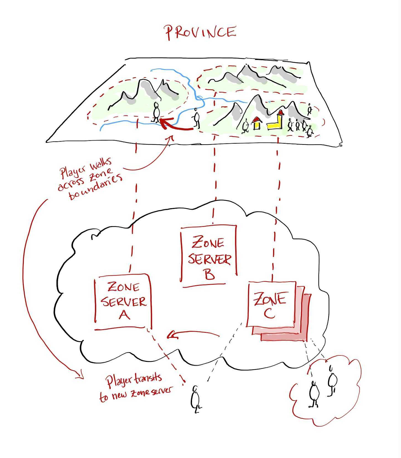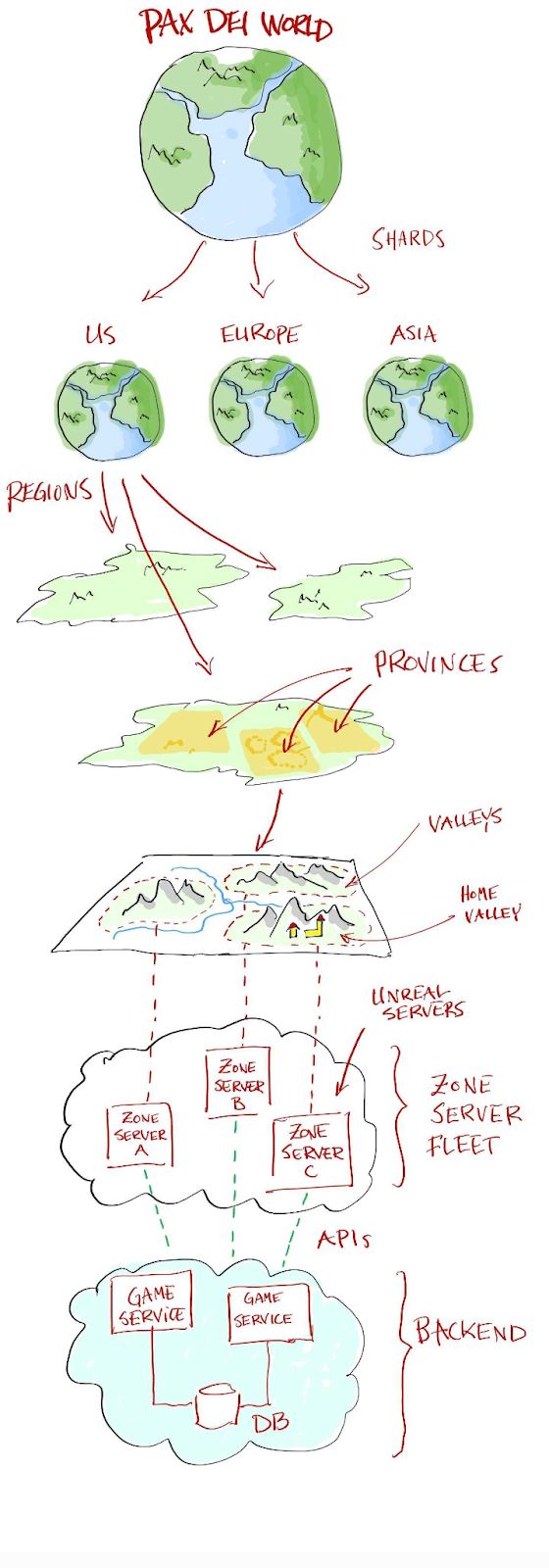 From a computational point of view, a shard consists of a large collection of various servers and cloud services, each of them fulfilling a specific function. The most numerous ones are what we call [b]zone servers[/b]. This is because the simulation of a whole world is much too computationally heavy to be handled by a single hardware instance and is thus divided into smaller computational units that we call [b]zones[/b]. A single zone server is a [b]Dedicated Unreal Server[/b] that handles the simulation of a specific part of the world, e.g., one home valley.
