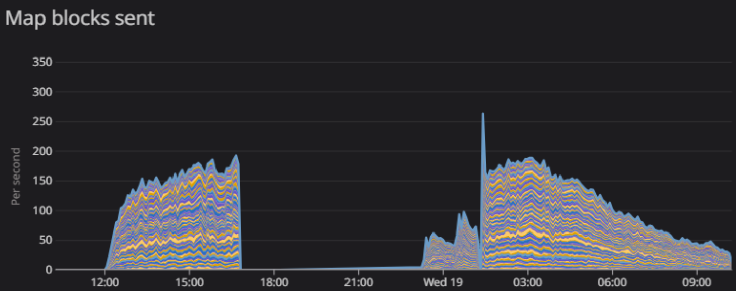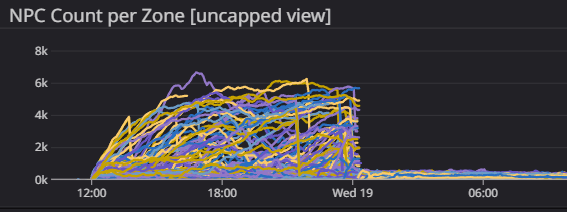 During all this, we had nearly forgotten about our initial worry: zone server performance due to mob population but we were happy to observe that after having applied the hotfix to selected zones, they seemed to be well under control and actually performing much better than before, which was great news. So, in parallel to all of the above, we started a rolling update of all zone servers across all our regions, which resulted in a brief disconnect for players while zones restarted but resulted in a much healthier CPU profile for all the worlds.