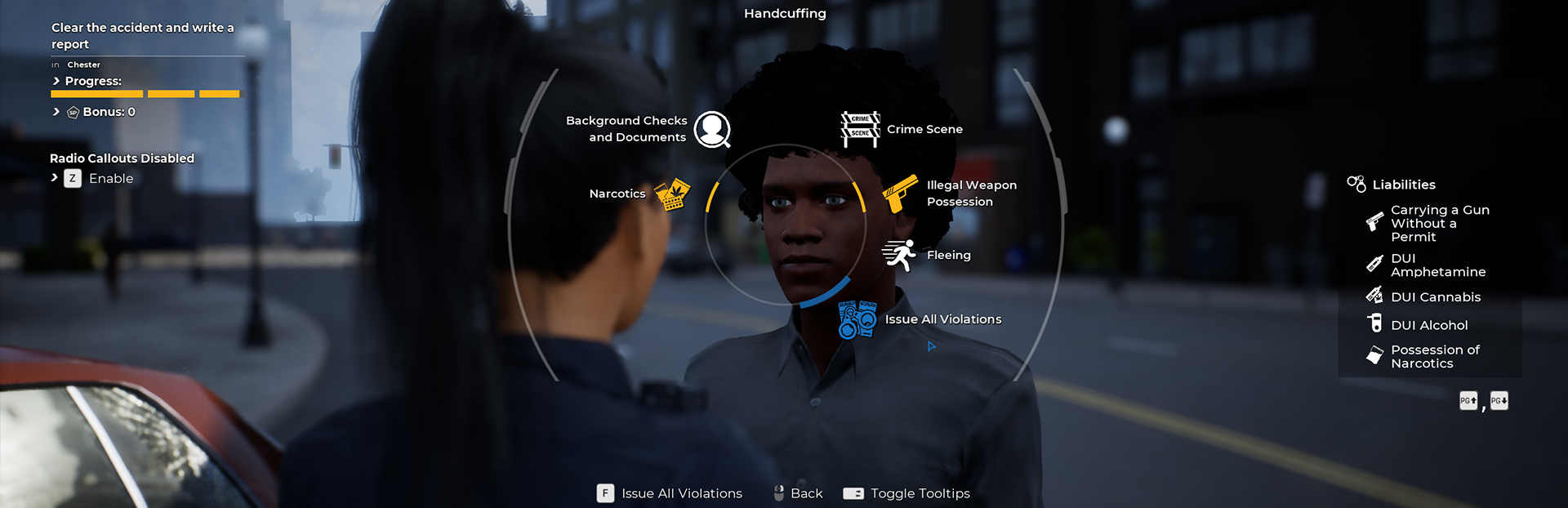 This feature was one of the most frequently requested, constantly being on top of the most upvoted ones on our official Trello Roadmap. As it provides another layer of realism – and quality of life, that’s for sure – it was an absolute no-brainer to start working on it. To ensure that this feature actually works, the team had to overhaul the UI when interacting with an NPC. When selecting ‘Issue Violations’, a new window called ‘Select Violations’ is shown on the right side of the screen. Selected violations will be put into this window, providing a constant overview of the applied charges, in addition to them being highlighted in the general interaction wheel. This way, you can give multiple or all violations at the same time – and are also able to arrest NPCs for multiple liabilities. Good to know: You will of course receive SP (or lose CP!) for every handed-out violation. So, if they were spraying graffiti, start fleeing, stole their ID card, and possess a ton of drugs… well, time to overwhelm them with charges!