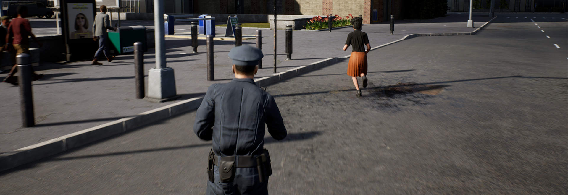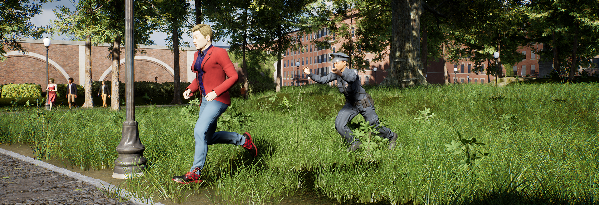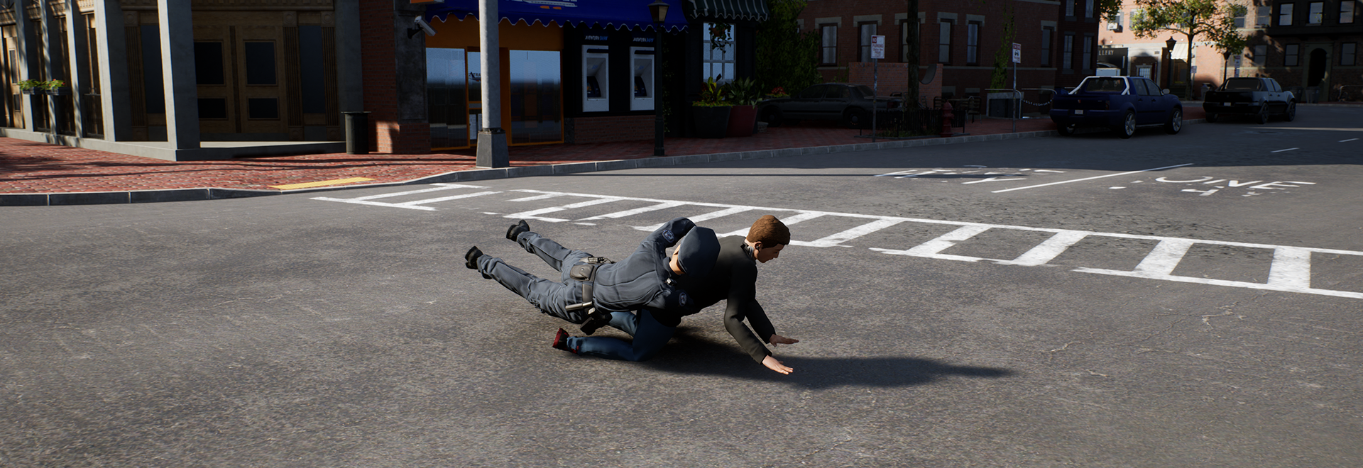 [b]Call to action![/b] To tackle a suspect, start running, get in close range with the fleeing person and in line of sight to get a button prompt. Use the button to tackle the target to the ground and handcuff them before they escape! Due to safety reasons, an officer is only allowed to tackle a person from behind or from the side, which will also detain them automatically. Make sure to always choose a place with enough space to be able to safely tackle a criminal!