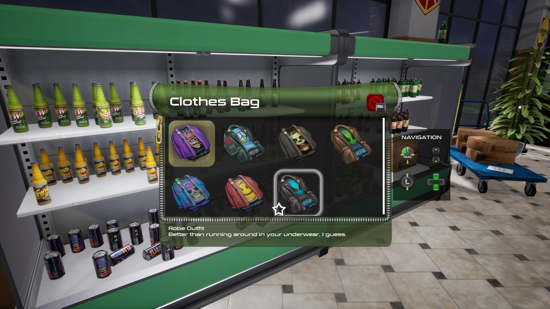[b]Clothes Bag![/b] In order to reduce the clutter in the inventory, we’ve implemented a new item, opening it will display a UI from which you will be able to select / equip your cosmetic skins. Note: Gameplay Outfits such as Cop and Drag Outfits will still be their own separate items in your inventory