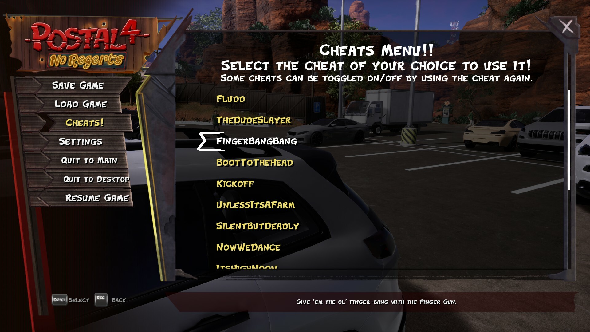 There is now a fancy new categorized cheat menu to spare you needing to look them up and input them into the console [i](Unlocks after finishing the game on any difficulty)[/i]