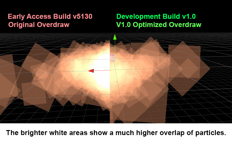 We've gone over every VFX in the game to reduce unnecessary particle counts. This again will help framerate across all platforms especially concerning low/mid end systems. The image above shows an example of the how much we've reduced overdraw. The VFX still look the same, but are much more performant.
