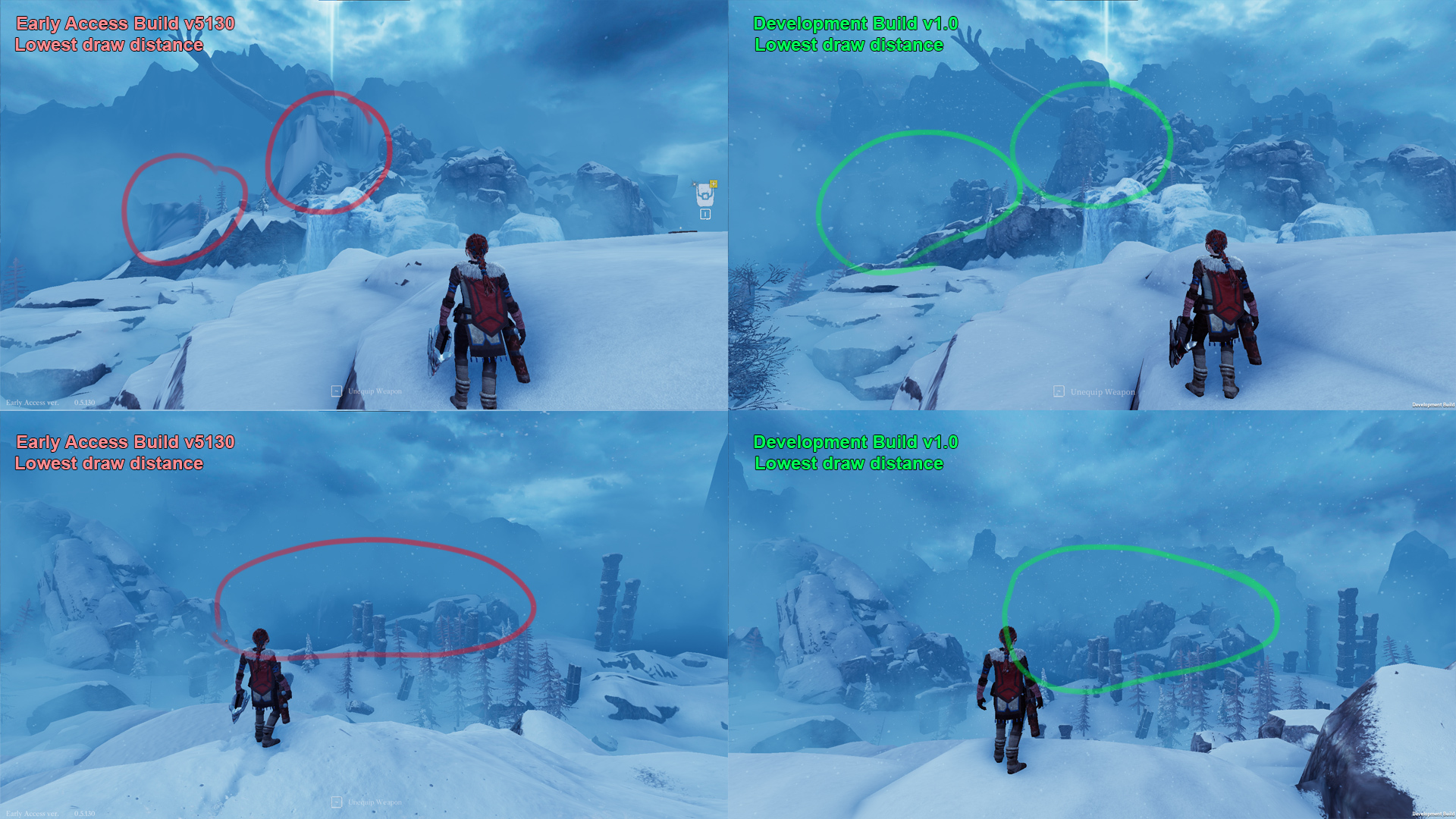 We've been quietly working on the list of polish and optimizations we have left to do. During that time, we did discover some other additional optimizations that'll benefit pretty much everyone regardless of system specs or platform choice. We'd like to share a few of those optimizations that'll be in the v1.0 release. [b]+ Improved proxies[/b] Proxies are basically low resolution models that we use when unloading the sectors of the game that are far out in the distance. You can see the old ones currently in v5130 by turning down draw distance to 0. For v1.0, we've completely overhauled these proxies and made them look almost identical to the actual in game visuals thus allowing the game to run at a lower draw distance but still look and feel as if it were at a higher draw distance. This is probably the biggest improvement that will be seen by most players, as it improves visuals for low end systems but also allows for mid-tier systems to achieve improved visuals. We've posted some images of both the latest development build and latest Early Access build. These were taken on a gaming laptop first with highest graphical settings and draw distance maxed, and then at its lowest setting. I did notice a small 2-3FPS drop when I took the screenshot using Windows screenshot tool so even these numbers are a little lower than what I saw in-game. Please understand these FPS results may not be the same for all systems but based on our tests there should be notable improvements for all.