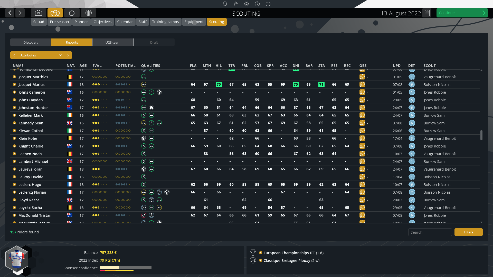 From the outset scouting has been tied to the youth movement that has been obvious in cycling for several seasons. For the game, we decided to stagger the categories by targeting the scouting of junior riders, meaning 17- and 18-year-olds, instead of young hopefuls (19 to 22). After looking at the system used in PCM21, we established several objectives: developing the system, increasing the player’s impact and creating mechanics that add to the game while regularly providing information.