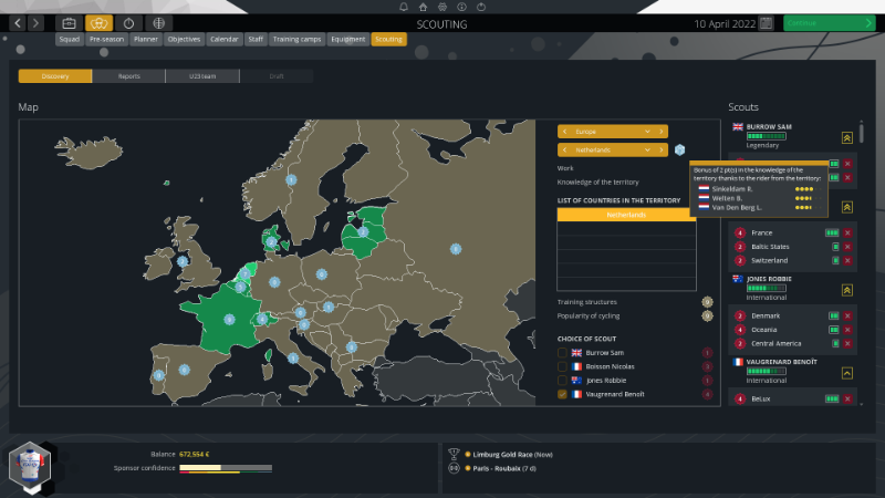 Each region is graded using two characteristics on a scale of 1 to 10: cycling popularity and the level of training structure. The first affects quantity, and the second quality. For small countries, developments may occur during or between seasons, but we'll go into more detail about that in an article on 'Regeneration'. Finally, for each region there is a knowledge grade, which goes up to 10. The higher the score, the more effective the scouting. To achieve a good score, you need scouts that know the region; at the same time, the longer they work there, the more their knowledge can progress (5 levels). Having a team and riders located in a region can also affect knowledge development.