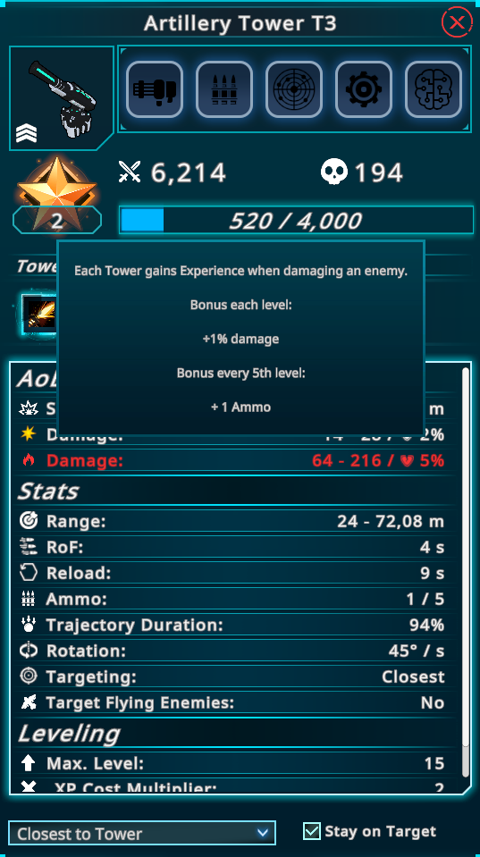 Each time a tower damages an enemy, they gain a fraction of the enemy xp, depending on how much damage they've dealt. When the tower reaches a certain threshold, it levels up. Each level gives a small damage buff which is +1% by default. This buff can be increased by the Skilltree or Tower A.I. Chips, that also increase various stats like the max level, required xp multiplier per level etc. (However, A.I. Chips do not provide new skills to the Tower anymore. (more on that in a later diary)) The tower level only counts for the current map, per tower and is reset either when you sell the tower or leave/restart the map. So it does not interfere with other systems like the skilltree or the player combat level for example.