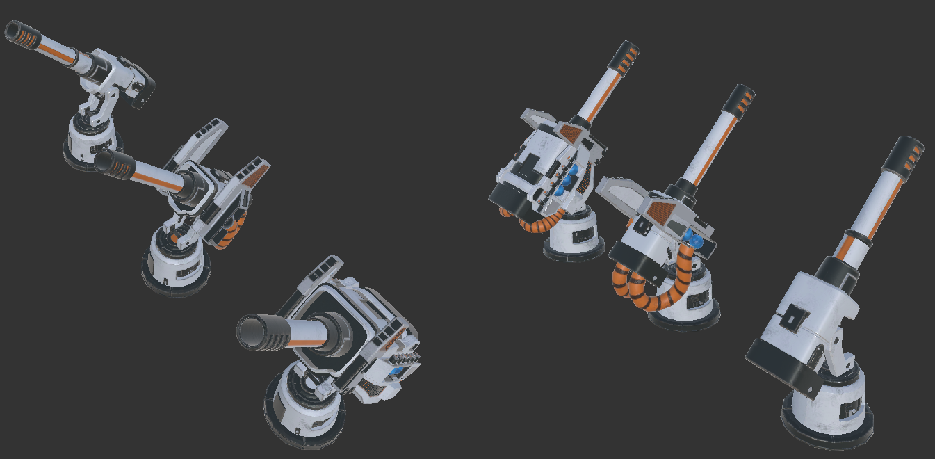We are also updating some of the visual aspects of the game. You may have noticed that the artillery tower has a new model (While the image still is the old one - classic wip screenshots amiright?) Before you panic: We'll add a feature to switch between old and new tower models. But we found a very gifted artist that is redoing all towers for us and we are very happy with his work! Our goal is to have the Towers look a little bit mor distinct between each Tier and also improve their visuals so you better haven an overview, which tower is at which stage currently. (And last but not least let it have more of an visual impact!) The Artillery Tower for example uses different colors of projectiles and effects to better visualize the progress of the plasma techniques used inside of it. Also here's an example of the new Artillery Tower models: