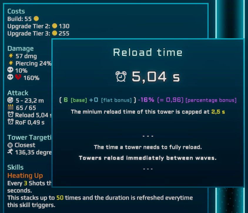 Since with recipe modifications and the new Alien Orbs you are able to craft very mighty equipment, it was necessary to cap some Tower stats so they can not go below or above a certain value. For example a Reload Time under 0,1s for the Railgun Tower leads to... "interesting" behaviours. Thus there are now some stats that are capped individually for each Tower:- Reload Speed