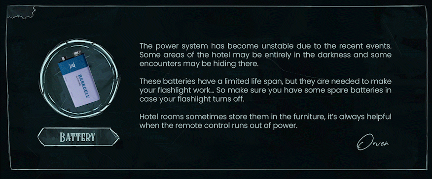 [/u] A you can imagine, you'll probably find yourself in dark environments while exploring the Paradise Hotel. In such situations, make sure you always have batteries for your flashlight to keep progressing through the game.