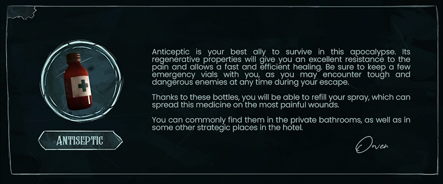 [/u] During your [i]stay[/i] in the Paradise Hotel, some encounters may be painful. You'll need enough antiseptic to heal you from bleeding. Using antiseptic vials to reload your healing spray will guarantee that you reach the next step of the adventure.