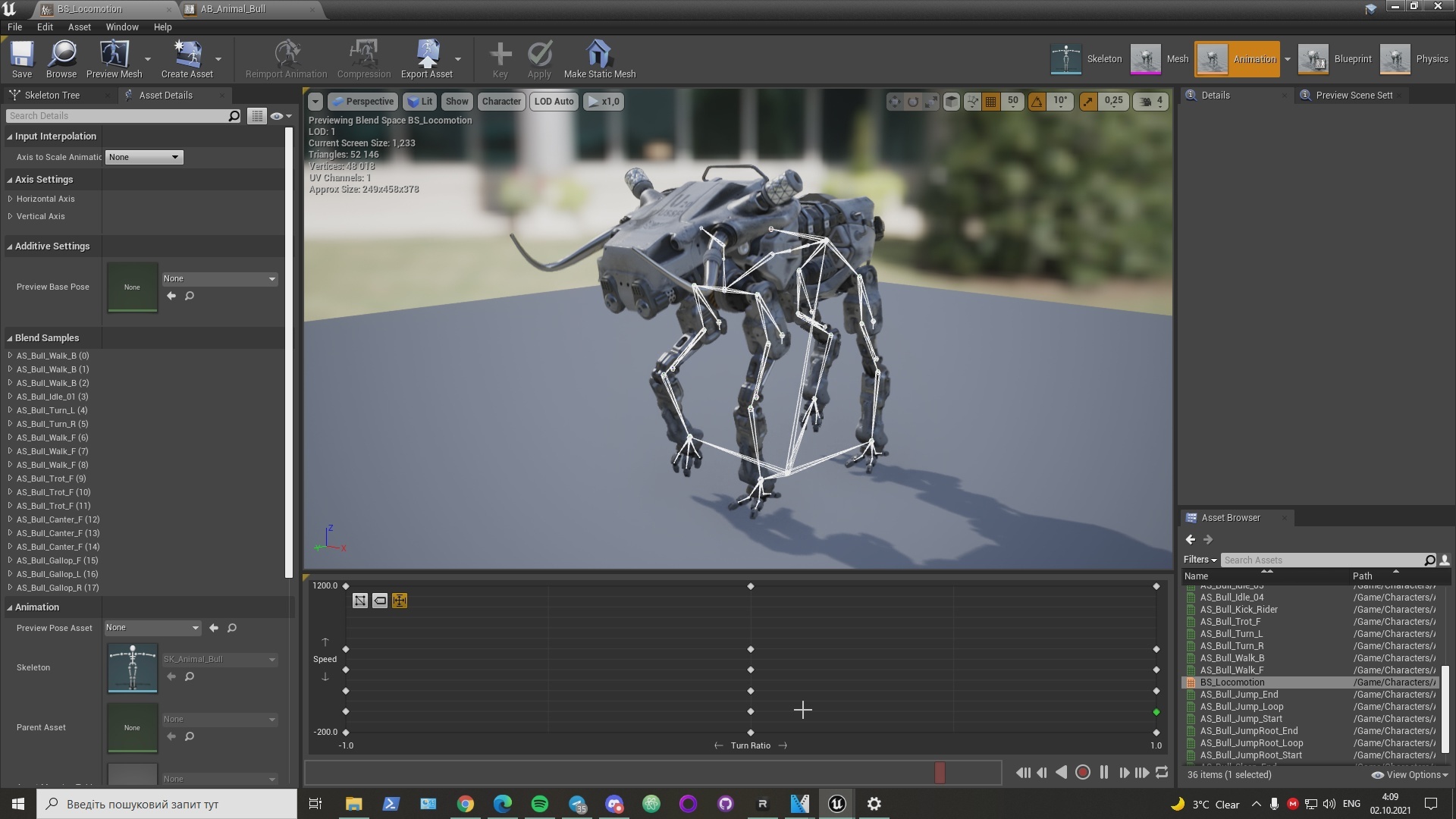 For start, let's take a deeper look at how the bull's animations work. In these terms the humanoid characters and quadrupeds are very different, which leads to the necessity of creating the animation system specifically designed for the creatures with four legs. In fact programming animations for quadrupeds is significantly harder than for a character with two legs. When the bull is walking on the unflat surface it’s body rotation has to be adjusted, the legs have to be accurately placed on the ground, and the feet have to be aligned with the surface. A system was made that traces the floor in 8 different locations and performs various calculations in order to adjust the bones movement.