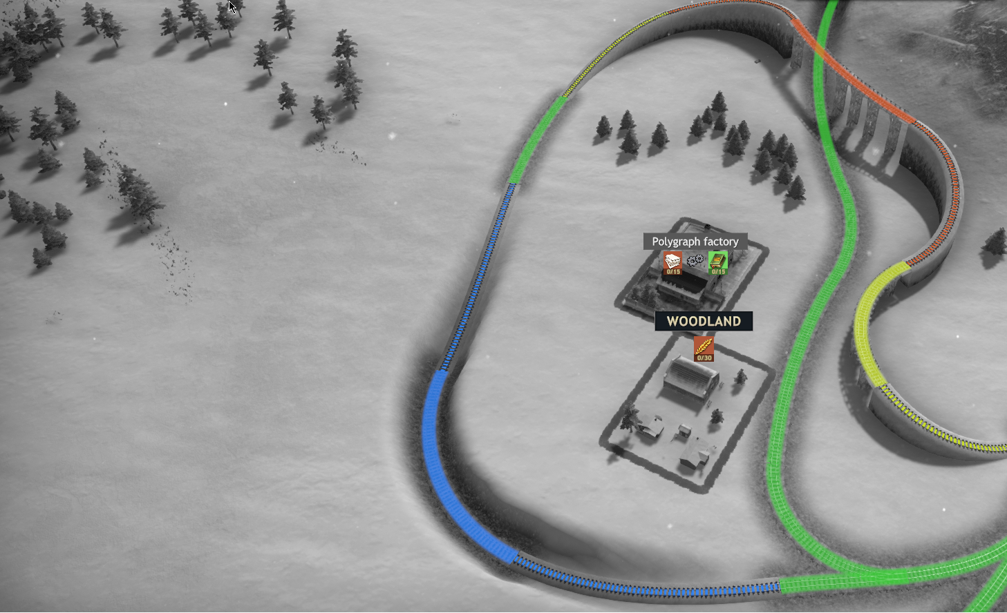 Tracks highlighted in green denote ground-level tracks, while blue tracks signify those below ground level. Yellow tracks indicate the first level above ground, while red indicates the second level above ground, which is the highest level within Railroad Corporation 2. So, if your train seems to be moving unusually slowly, you can use the height view to see if the train’s slowness is caused by a change in elevation.