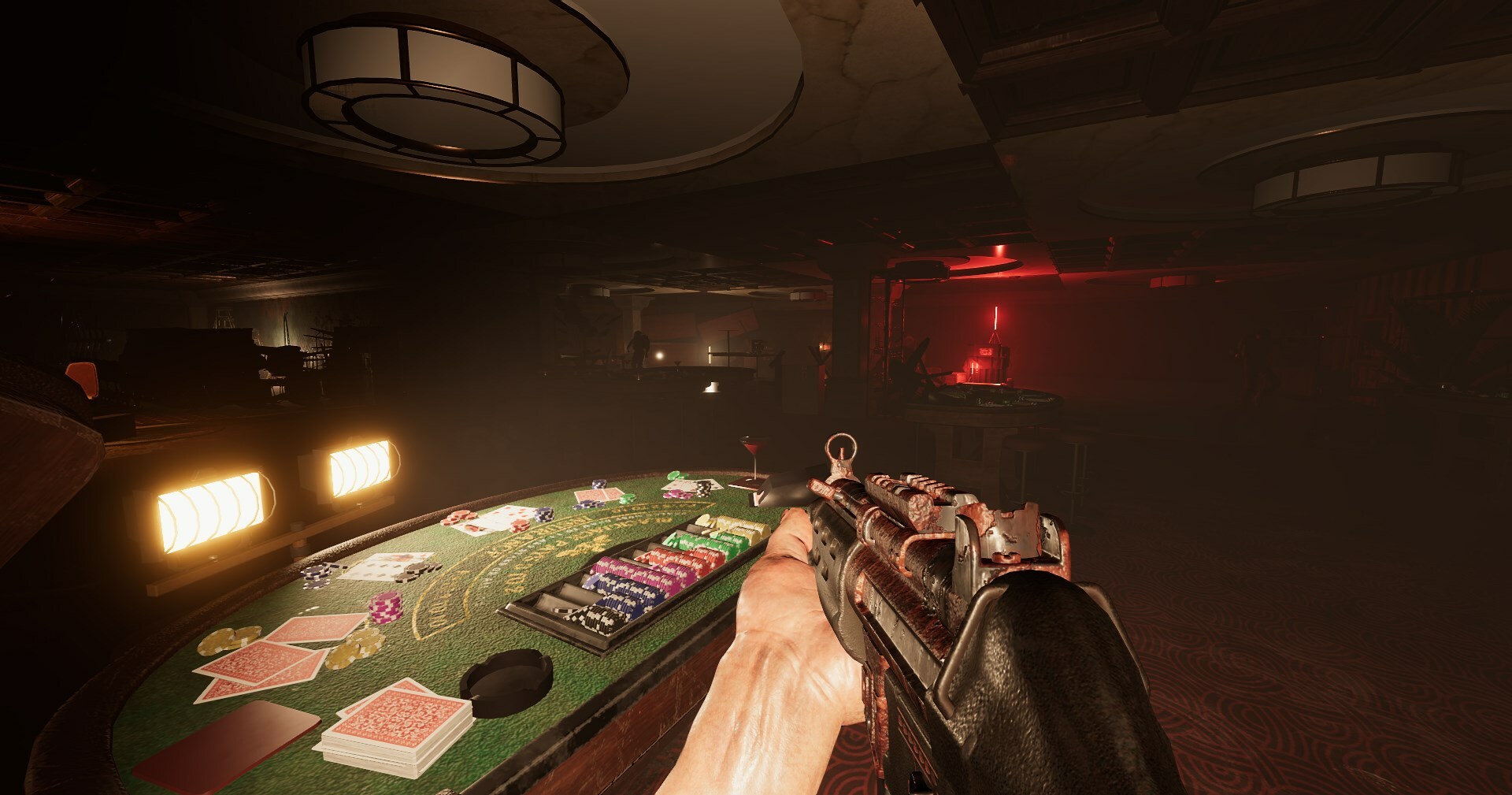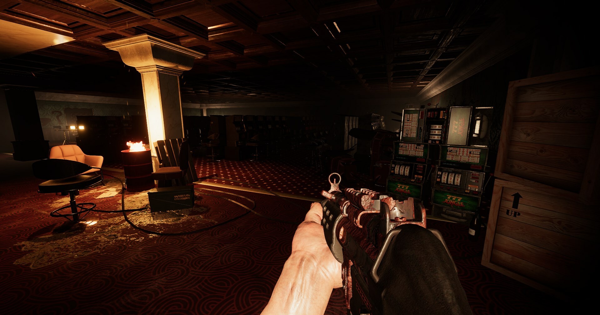 For the past months I've been working on a new map. (amongst other things) Casino is the 5th map available and is aimed at giving the player some more things to do during gameplay rather than only surviving the horde. Take a good look around in the dark, see if you can find anything that might light up the place, or worse, something fuelling someone's hidden gambling addiction.