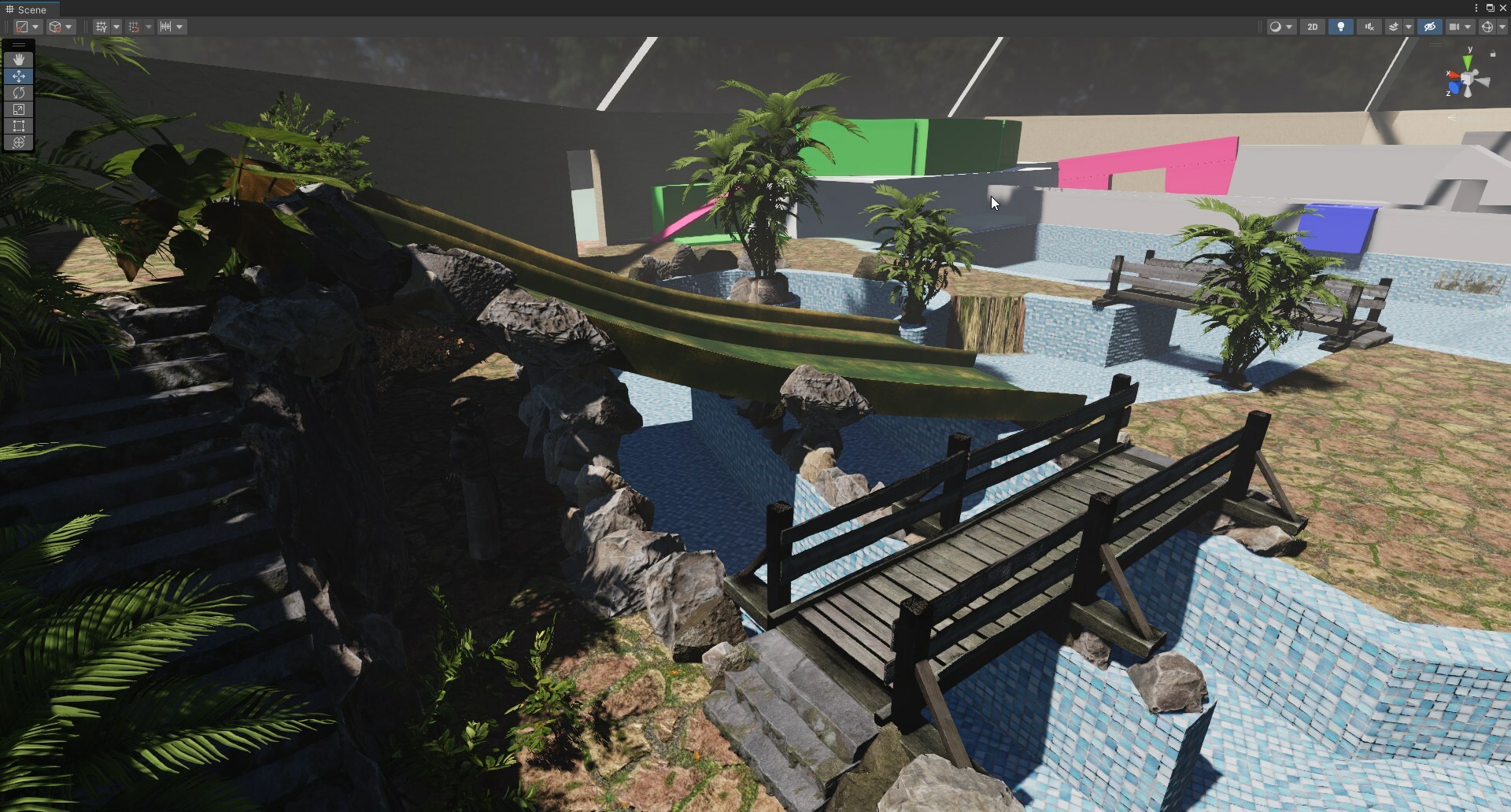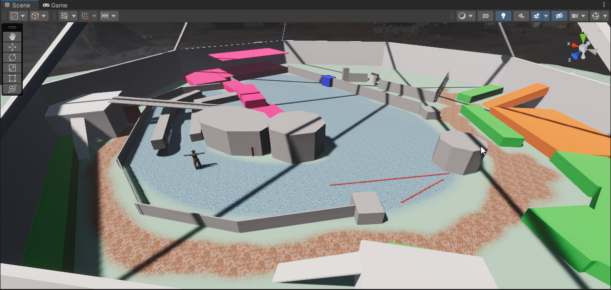 Around the end of January I started working on the first actual map that is designed around the ruleset that I came up with. The current screenshots which you can see on the store are partly of the Factory map, which was designed as a map to show off graphics and gameplay in the fastest way possible, so don't think of how and why things are placed but just have it look like it could be a map. The ruleset (or design rules) I came up with are based on looking at various other shooters out there that have good maps (and also bad ones, it's good to know what to not do!). Some of the rules I came up with are as follows: - Every map needs a unique aesthetic, look and feel. (The unique aesthetic could be a crashed plane or a big submarine in the center of the map) - Every map needs a variety of sightlines. (ranging from short to long, to support all types of guns that you like to use) - Every map needs to be at least 50% outdoors. (Meaning a view of the sky, this will be needed in the future) - Every map needs to support at least 1 alternate weather condition. Tropicana fits the unique aesthetic as an overgrown sub-tropical swimming pool, the dense foliage in various places combined with open center pool allows for various ranges of sight. Here are some screenshots of Tropicana! [i]The start of Tropicana. A rough block-out.[/i]